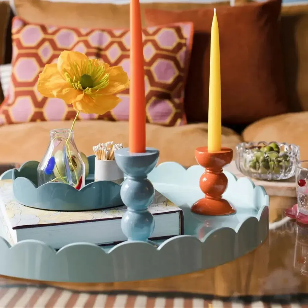 A pretty chambray blue coloured round scallop small tray finished in 20 coats of high gloss lacquer, hand polished between each coat. The base is painted black satin and embossed with our logo.