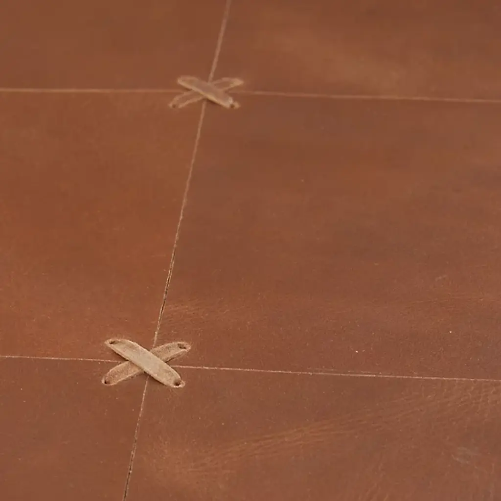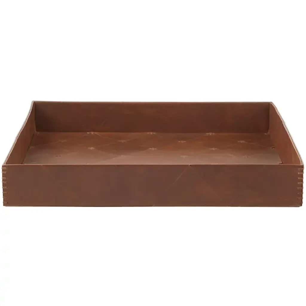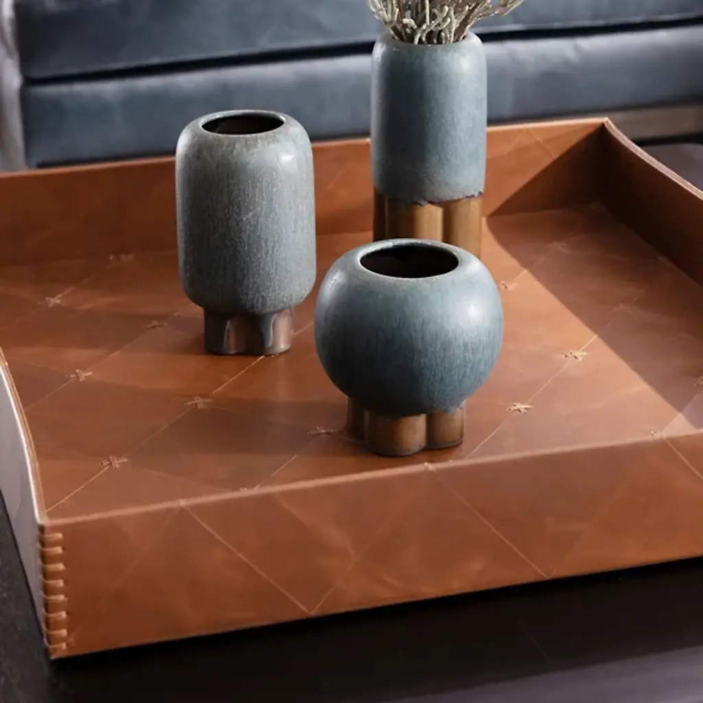 Crafted from cognac leather, the Channing Tray from Arteriors draws inspiration from natural stitching and patchwork techniques. Its elegant craftsmanship is accentuated by cross-hatched details that emphasize minimalistic lines. Each piece features a unique finish, ensuring a distinctive addition to any space, perfect for both decorative display and functional use.