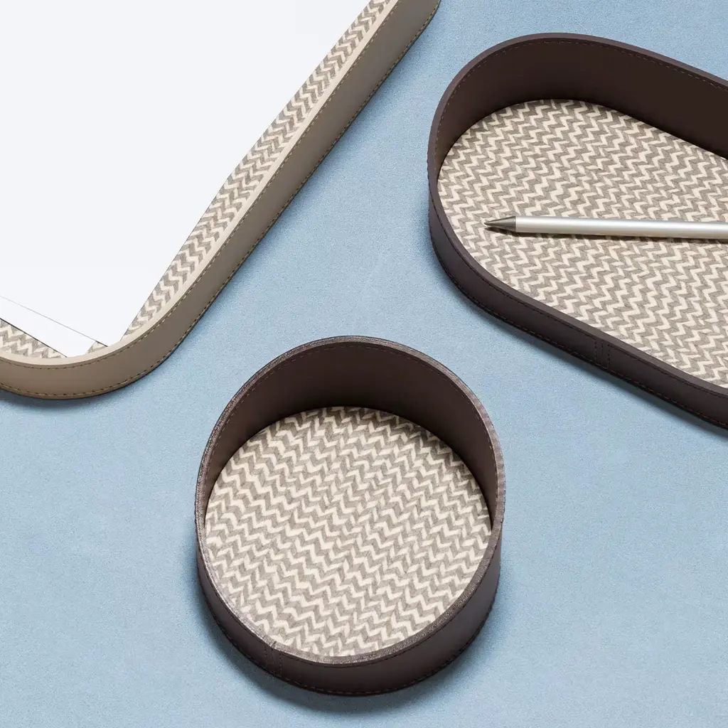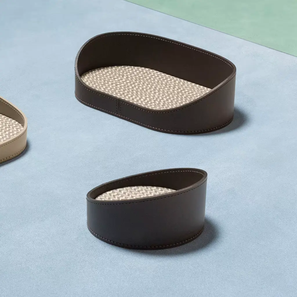 Inner surface made of laminated wood and nest regenerated reinforced leather structure with water-resistant and UV-resistant finish. The juxtaposition of Tecnocuoio® and wood with unique textures generates a vibrant interplay of materials. Other colors are available. Please ask Concierge for details.