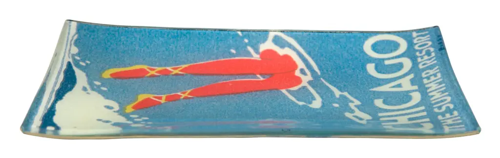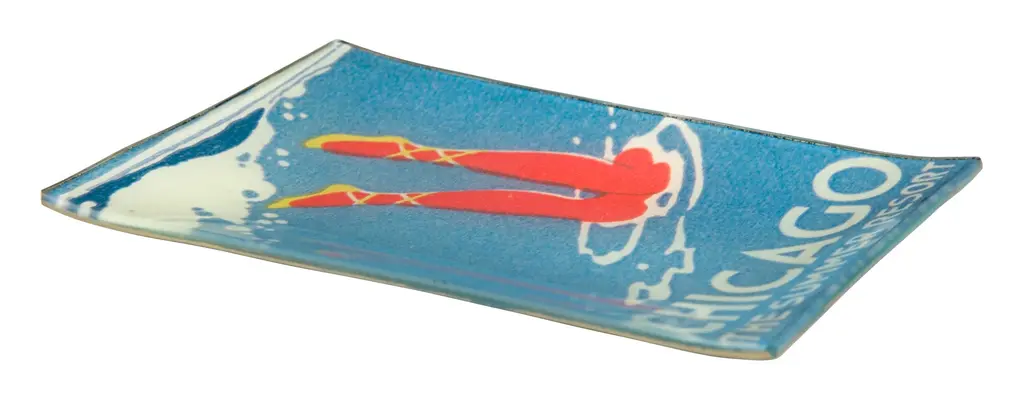 The Chicago Tray has us dreaming of beach weather and a jump in Lake Michigan. It features a charming illustration of a young lady mid-dive into our great lake, paired with the message "Chicago: The Summer Resort" in blocky vintage typeface. Taken from a early 1900s poster promoting travel to the Windy City, this image has been reproduced under handblown glass to create a decoupaged plate that's worthy of hanging but just as great as a catch-all on the entryway table. •glass tray •decoupaged vintage image •black felt backing •john derian Dimensions •4.5"W x 6.5"D x .5"H