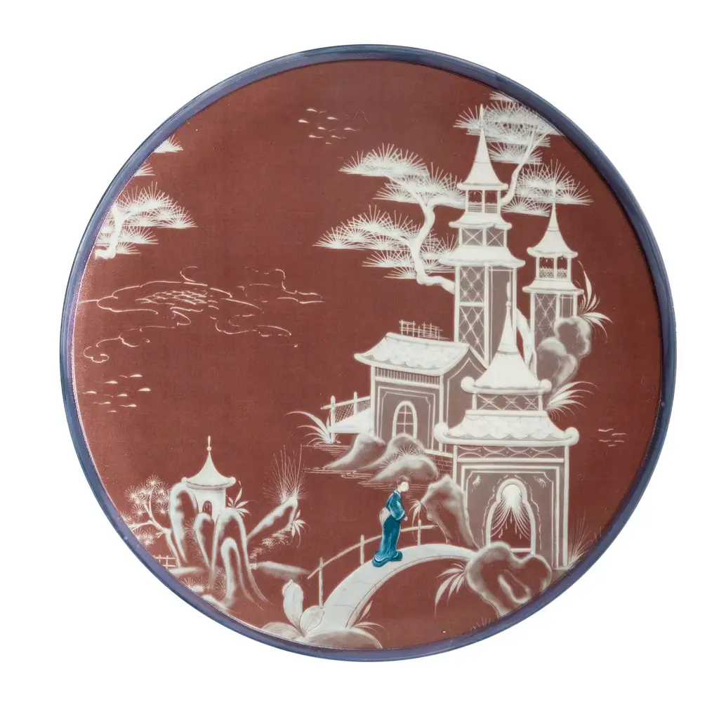 This is a square ( with curve ) tray with rustic pattern brick red lacquer base color. The surface is painted with yellowish golden colorful chinoiserie style graphics and an oriental scenery theme. ( Not for serving ). It can be a tray table by adding a base or wall art with hinges added.Dimensions: 27" x 27" thickness 1" Origin: ChinaMaterial: Wood, MDFCondition: Vintage style finish, handmade(buyers of Hawaii, Alaska, US Islands, Florida Keywest, and Canada pays the extra shipping cost). Insurance and handling charges are already included in the shipping cost.