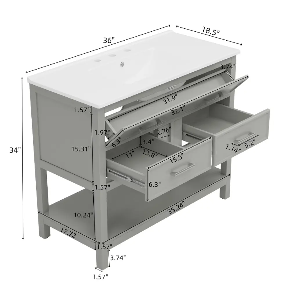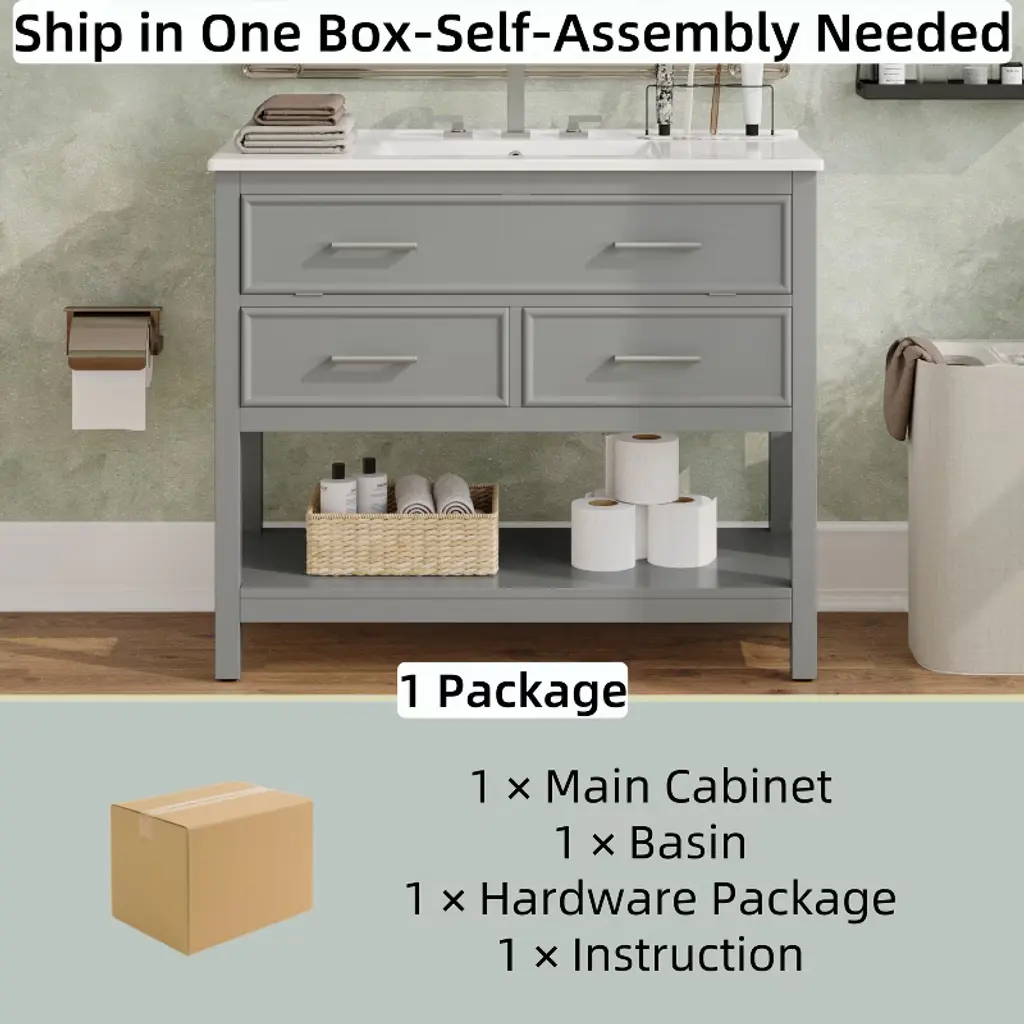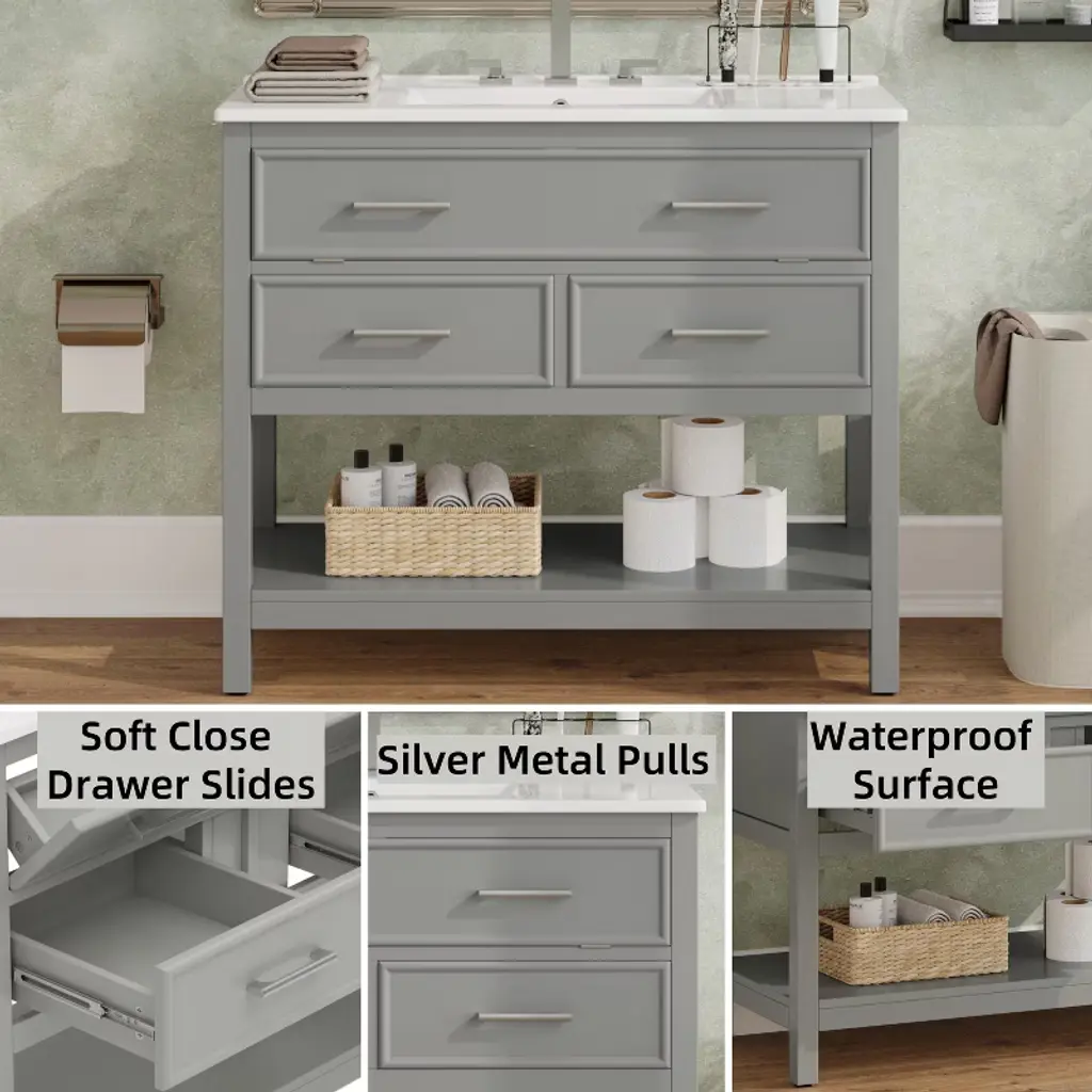 Christopher Knight Home Lowell Contemporary 36" Bathroom Vanity With Ceramic Sink, Tip-out Tray, 2 Drawers And Open Shelf, Gray