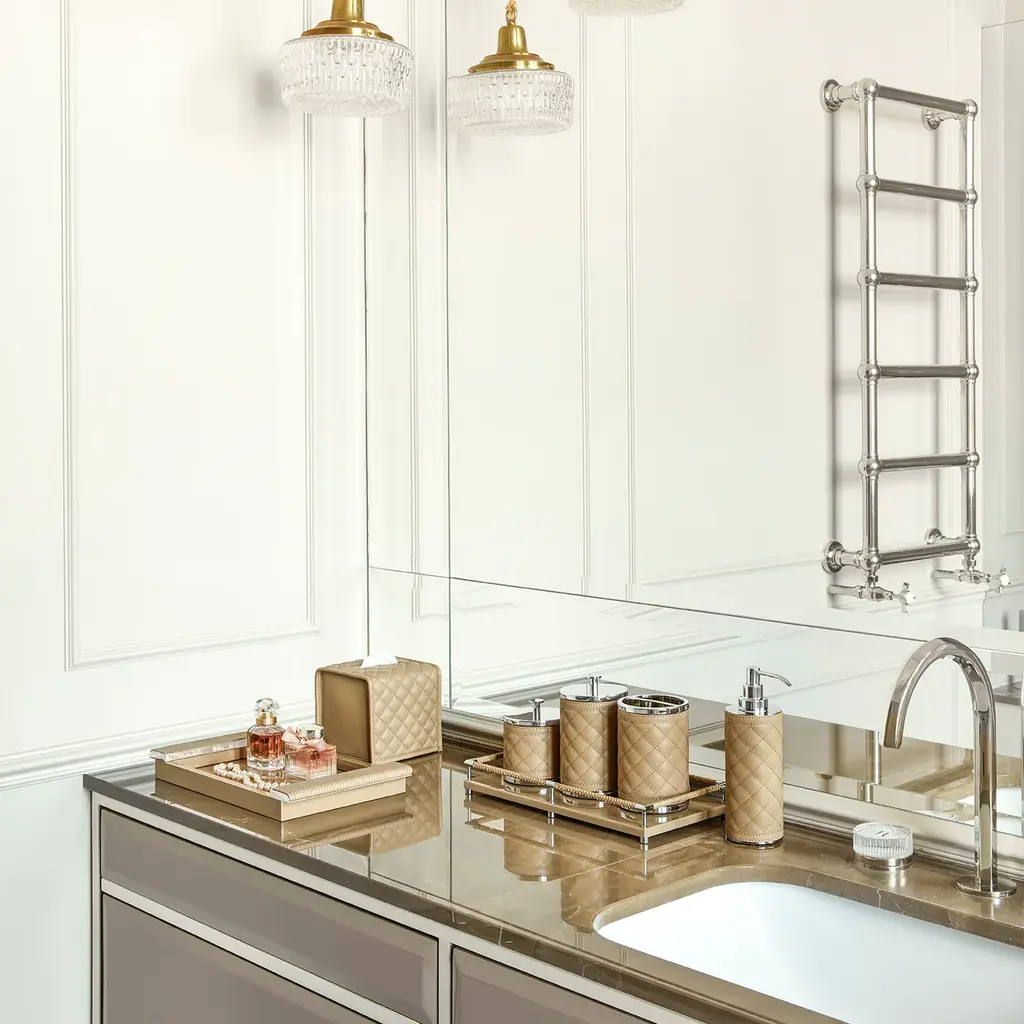 Circe rectangular tray is a symbol of the precision of details born from the most skillful craftsmanship. A simple shape combined with precious metals, braided leather plate handles and lacquered wood create fine, elegant trays, prefect for every occasion. Laquered tray with leather-wrapped handles, and chrome or gold details.