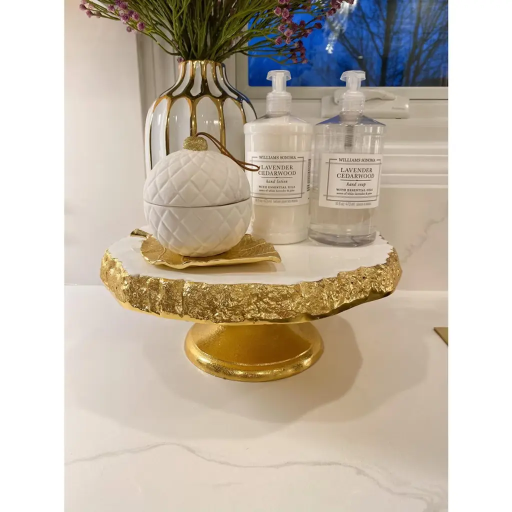 Show off cakes in style with this chic cake plate, featuring a marble base, gold footed design and a rim. Its timeless, elegant flair will bring a touch of sophistication and class to any room. The perfect way to serve up homemade cakes as special treats or to celebrate important occasions.