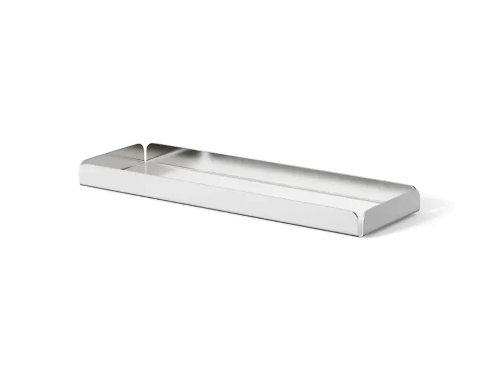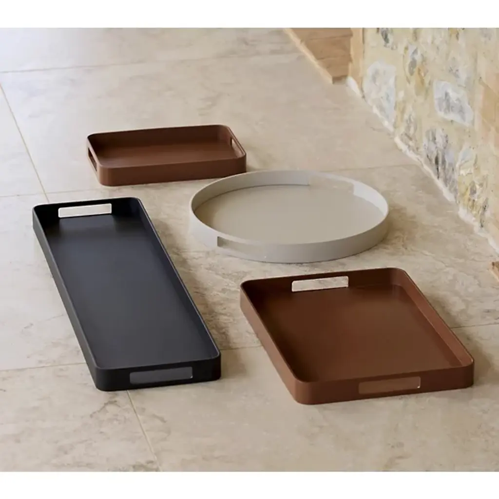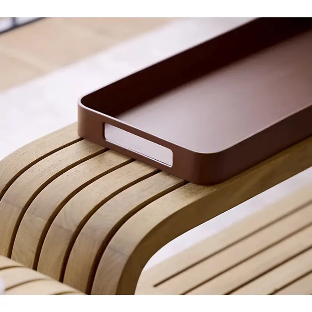 The Club Tray from Cane-line serves multiple purposes with its rectangular aluminum construction and integrated carrying handles. This serving piece excels at both indoor entertaining and outdoor gatherings, offering a stable surface for drinks, appetizers, or decorative items. Its proportions make it manageable for one person to carry while providing ample space for serving multiple guests. The tray's low profile design allows it to rest comfortably on ottomans, side tables, or outdoor surfaces without overwhelming the surrounding furniture arrangement.