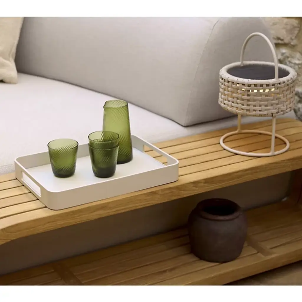 The Club Tray from Cane-line serves multiple purposes with its rectangular aluminum construction and integrated carrying handles. This serving piece excels at both indoor entertaining and outdoor gatherings, offering a stable surface for drinks, appetizers, or decorative items. Its proportions make it manageable for one person to carry while providing ample space for serving multiple guests. The tray's low profile design allows it to rest comfortably on ottomans, side tables, or outdoor surfaces without overwhelming the surrounding furniture arrangement.