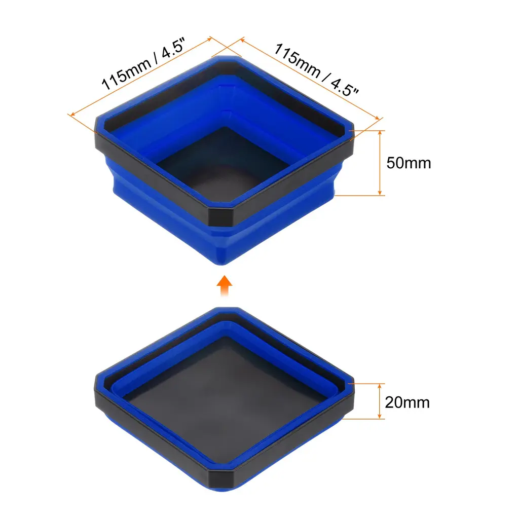 The magnetic tool tray is silicone and easy to clean with just soap and water. It easily expands to 2 inches and collapses to just 3/4 inches, when unfolded, it provides ample storage space; when folded, it's portable and fits easily into a tool bag or pocket.The foldable magnetic parts tray adopts the design of double-sided magnetic base to ensure that the product has suction, wider adsorption surface, and more uniform magnetic force, which can firmly grasp your parts and easily attach to various metal surfaces, and will not Slide off easily.The collapsible magnetic parts tray is suitable for holding bolts, screws, washers, nuts, small metal tools, and parts, helping you keep your work area neat, clean, and organized, also suitable for automotive technicians, mechanics, engineers, carpenters, plumbers, amateurs Enthusiasts, etc.Notice: When using collapsible magnetic parts tray, keep it away from sensitive electronic devices or computer equipment, as the magnet may interfere with their operation.