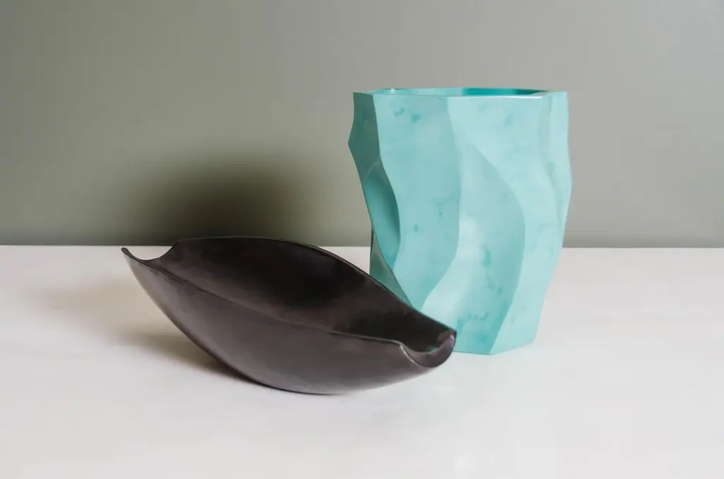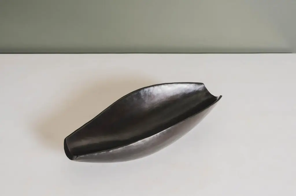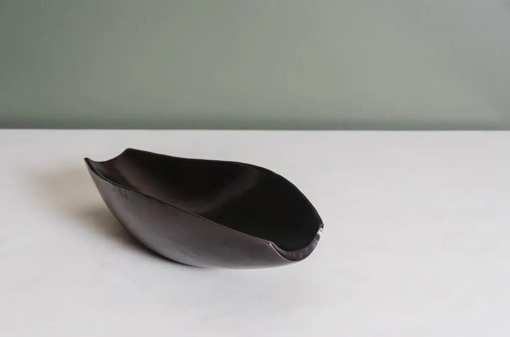 Bai He trayBlack copperHand repousséLimited editionEach piece is individually crafted and is unique. Repoussé is the traditional art of hand-hammering decorative relief onto sheet metal. The technique originated circa 800 BC between Asia and Europe and in Chinese historical context, it began early as the Han Dynasty (206BC-AD220). The technique involves using a hammer and various shaping tools.