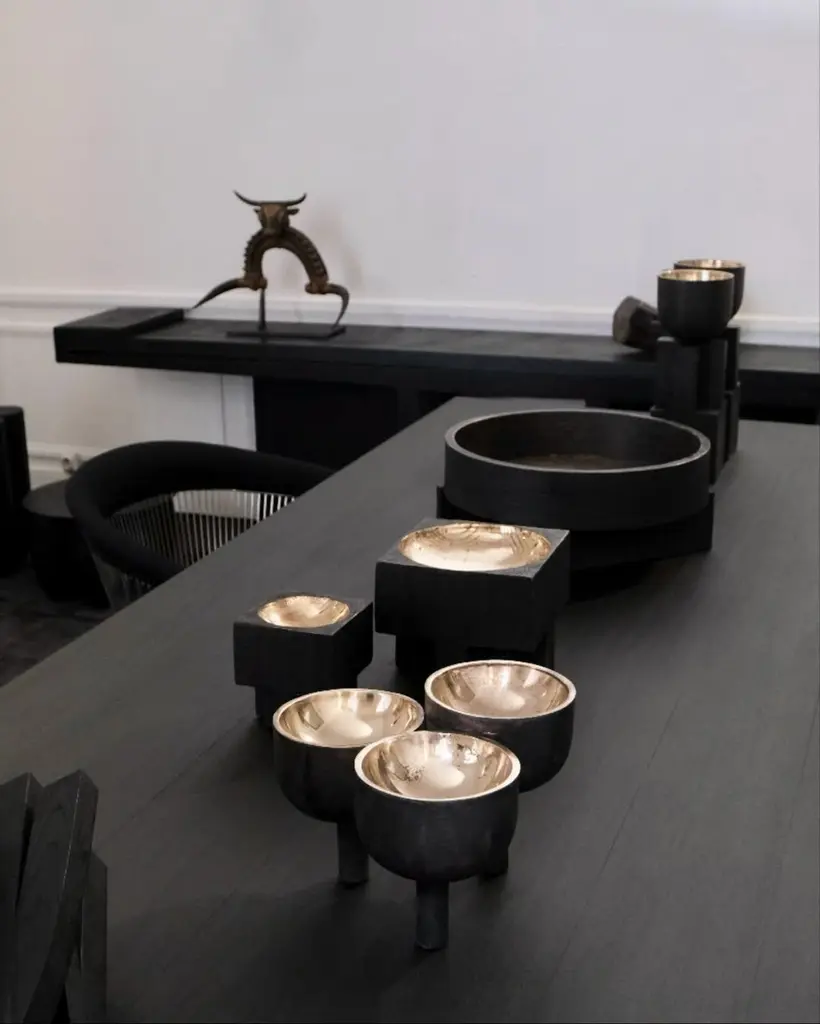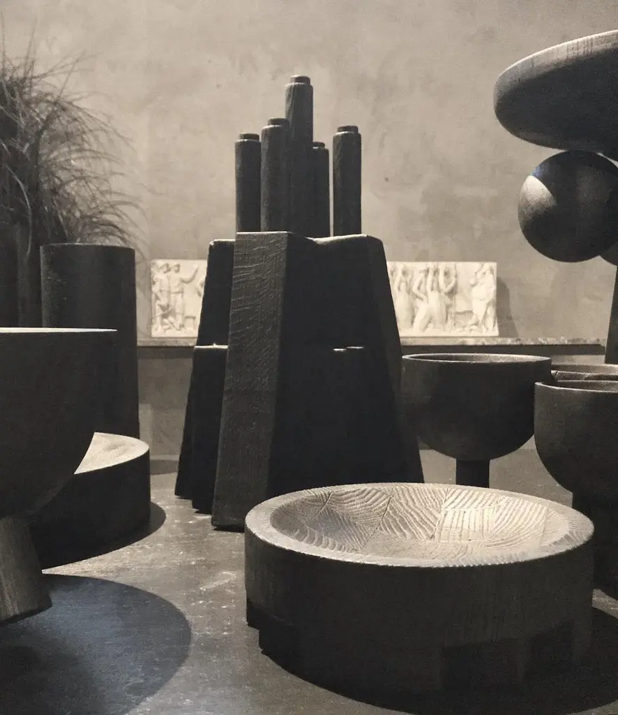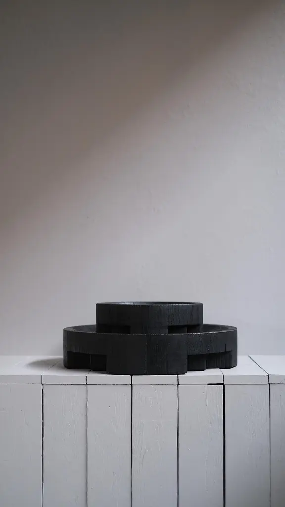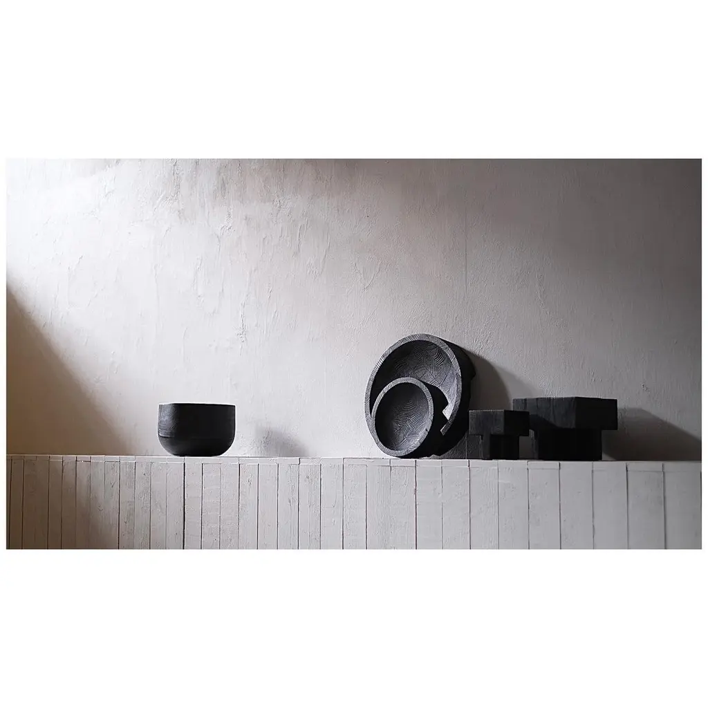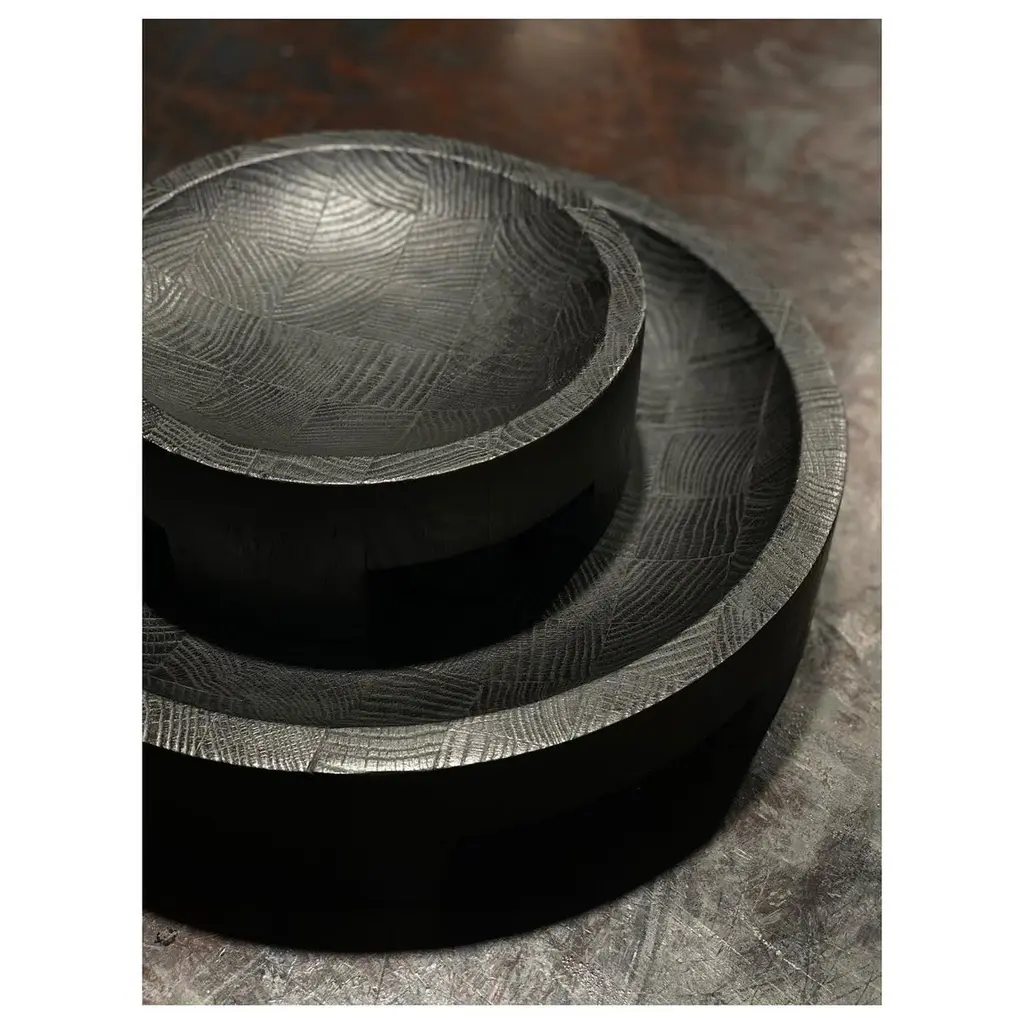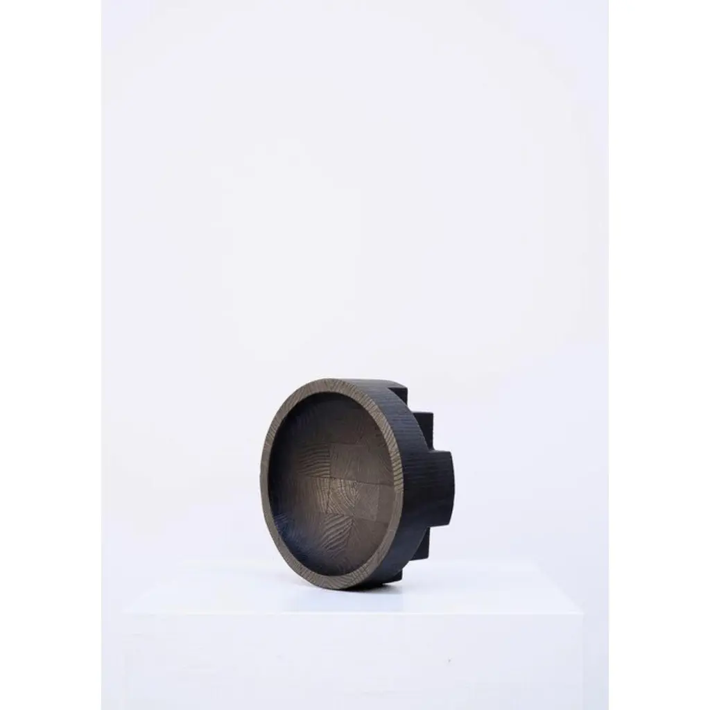 Disk tray large black by Arno Declercq.Dimensions: D43 x W43 x H9 cm.Meterials: burned and waxed Oak.Signed by Arno Declercq.Arno DeclercqBelgian designer and art dealer who makes bespoke objects with passion for design, atmosphere, history and craft. Arno grew up in a family with parents who like to work with beautiful brands and objects.His father studied at the Royal Academy of Arts Fashion Department, he worked for Bikkembergs and made his own fashion brands, but has also collected tribal arts for more than 20 years. His mother, who worked with his father from the beginning, bought a shoe store in 2010 where they sold brands as Rick Owens, Ann Demeulemeester, Maison Martin Margiela, ... With the interest in beauty he learned from his parents, Arno studied interior design, after learning a lot about materials and with great knowledge of history he designed interiors and opened his own gallery for ethnographic art and design.The collection has come to the idea that there are too few interiors where they no longer have the big and static vases and candlesticks that the people had in big houses over 100 years ago. By focusing on architecture, ancient arts and design, after war buildings, defence buildings (bunkers and fortresses) and tribal arts, he created a collection that became a Classic. Each piece is unique because it is entirely handcrafted by him. Made of tropical hardwood called Iroko this he discovered after one of his many trips to West Africa interested in voodoo arts.In these strange tribal arts, the wood "Iroko" is used in many objects, according to their culture, the ancestors lives in these trees, and they also call this tree "the king of the forest".Arno also combines this with Belgian oak, that dried for more than 30 years, wood that was provided for the many furniture makers in Mechelen.By treating these objects through the Yakusugi technique or another mentioned "Shou Sugi Ban" an ancient Japanese technique where the objects are burned to protect the wood from weathering and subsequently fixed to get a patina look as long as possible. This gives each object a unique texture.