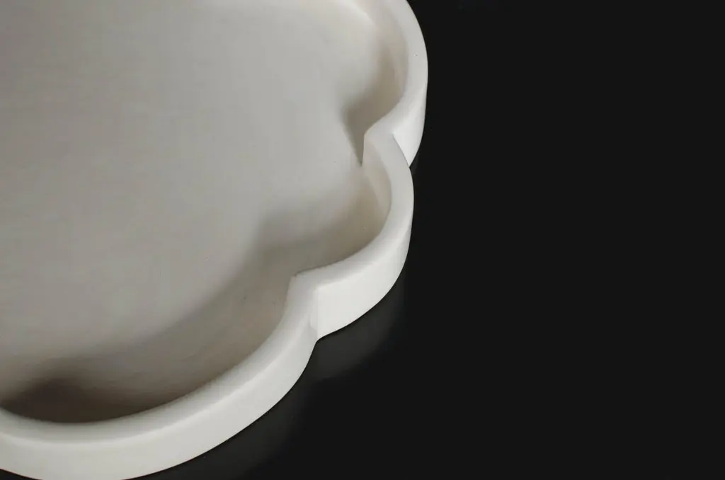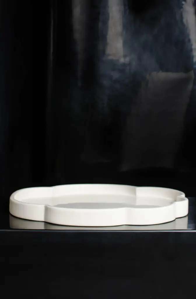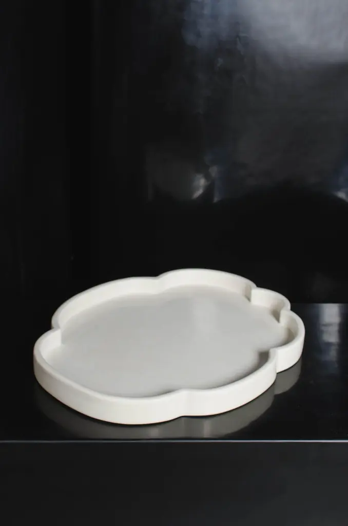 Cloud design trayCream LacquerHand RepousséLimited editionEach piece is individually crafted and is unique. Lacquer is a technique that dates back to the Shang dynasty, circa 1600-1100 B.C. These pieces are made with at least 60 coats of organic lacquer. Each layer of lacquer is applied with a curing period of 24 hours in between so that it can dry.