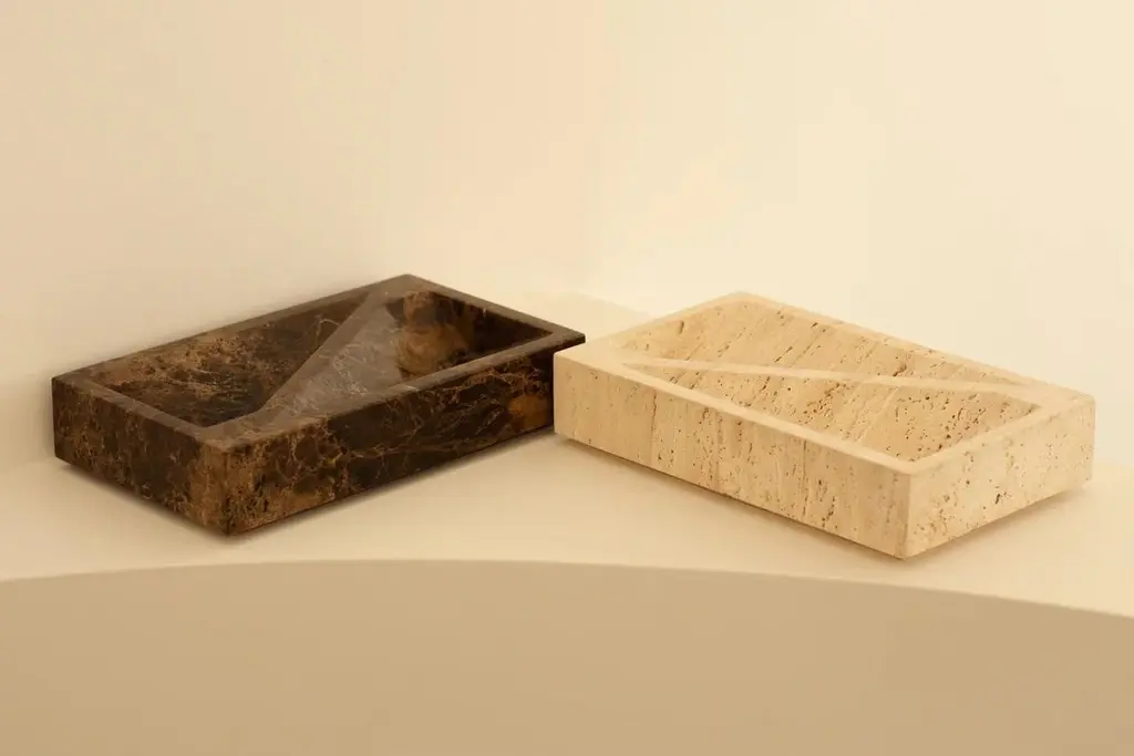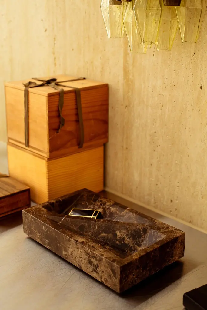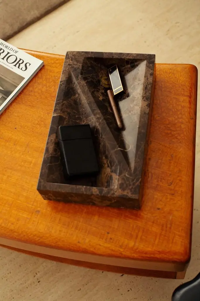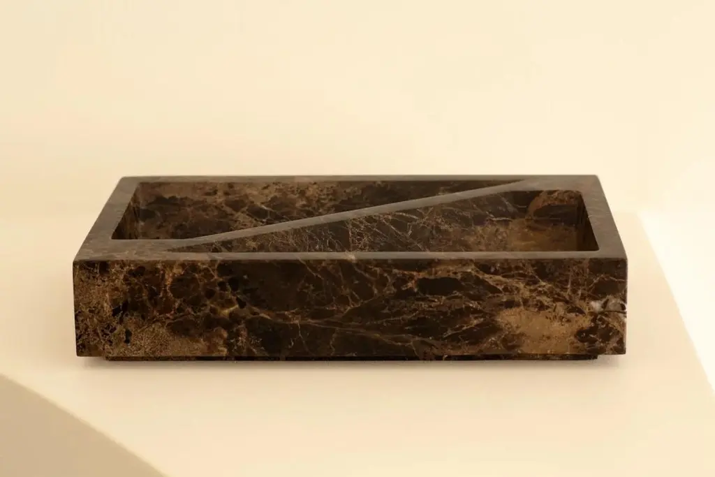 Persian Brown Block Tray by Henry WilsonLimited Edition of 50Dimensions. W 30 x D 18 x H 7 cmMaterials: Persian Brown marble.Available in Classico travertine and Persian Brown marble.Block Tray is a limited edition of fifty pieces inspired by Modernist sculpture and architecture – particularly the detailing of 1960s façades. It also evokes the work of Carlo Scarpa, whose precise geometries and skillful manipulation of light and shade leavened volume and gravity with pleasing understatement. As Philip Johnson summarised, the Venetian architect could ‘‘make poetry out of the smallest rod or piece of stone.’’Amply proportioned and crafted from solid stone, Block Tray offers two diagonally sectioned concavities, with a generous shadow line lending a floating effect to its substantial, plinth-like form. It’s a perfect receptacle for everyday valuables – keys, card case, coin wallet – or for clusters of stationery, collectibles, or smoking materials.Henry Wilson's work combines a rational, democratic utility with an element of sculptural expression. There is a clear form and function in our products, but it’s important they also have feeling. We are interested in the awkward beauty that comes from something made by hand. We like to explore how imperfection can be introduced into an industrial process, to make something at scale that retains a sense of individual charm.Permanent collections and exhibitions- Museum of Applied Arts and Sciences, Sydney, Australia- Art Gallery of Western Australia, Perth, Australia- 'Sempering' XXI Triennale, MUDEC, 2016, Milan, Italy.