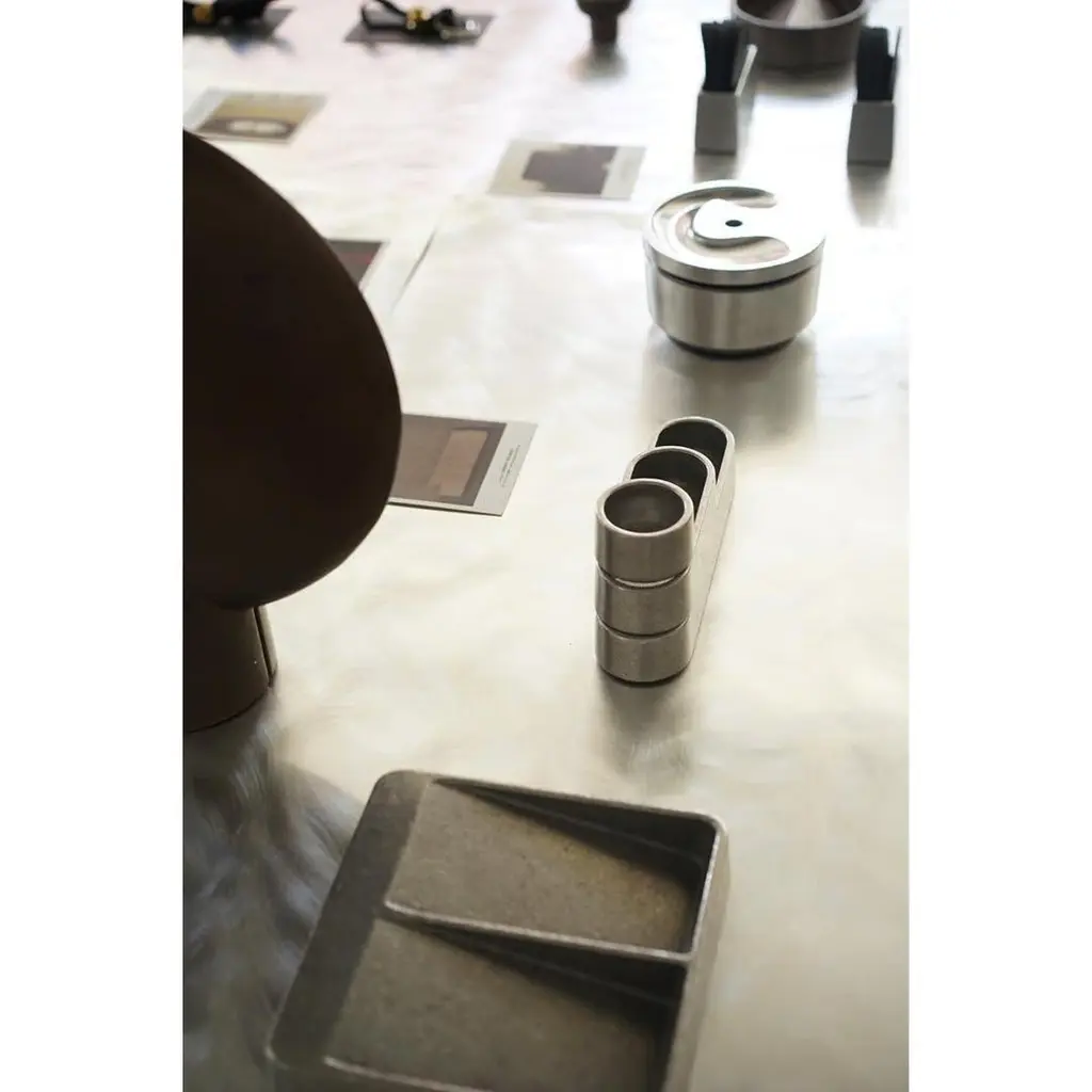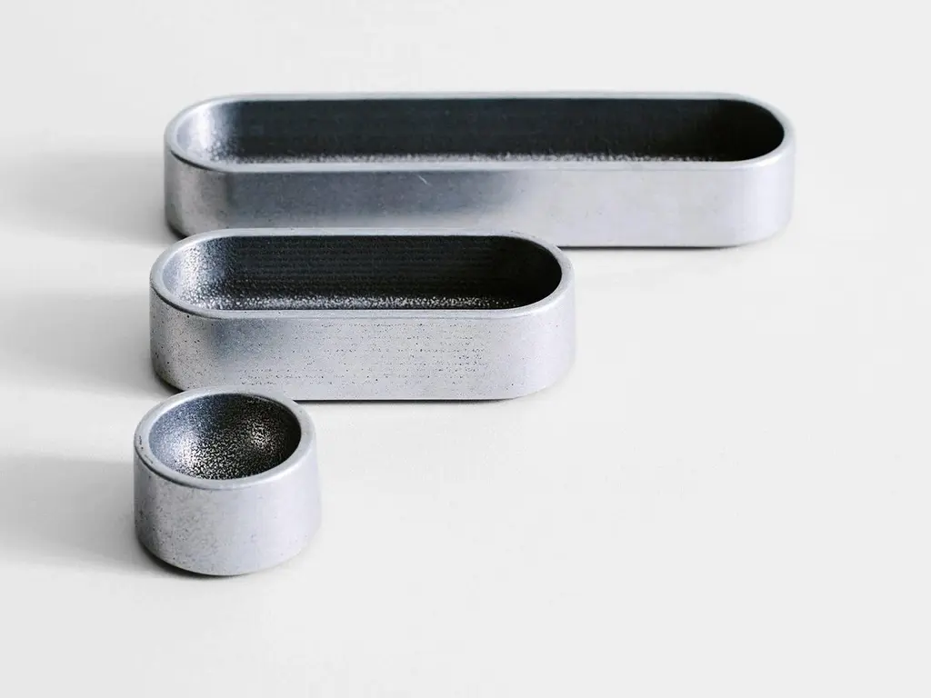 Aluminum Stack Trays by Henry WilsonDimensions: W 25 x D 5 x H 10 cmMaterials: Aluminum The stack trays are sold in a set of three that can be used together or individually. Group them on your desk, dining table, or next to the bed. The stack trays are made, polished, and finished in Sydney, AustraliaCastings will arrive with a bright finish but will oxidise and darken over time to reveal a distinctive patina. Simply use a metal polish to restore a like-new finish.Henry Wilson's work combines a rational, democratic utility with an element of sculptural expression. There is a clear form and function in our products, but it’s important they also have feeling. We are interested in the awkward beauty that comes from something made by hand. We like to explore how imperfection can be introduced into an Industrial process to make something at scale that retains a sense of individual charm.Permanent collections and exhibitions- Museum of Applied Arts and Sciences, Sydney, Australia- Art Gallery of Western Australia, Perth, Australia- 'Sempering' XXI Triennale, MUDEC, 2016, Milan, Italy.
