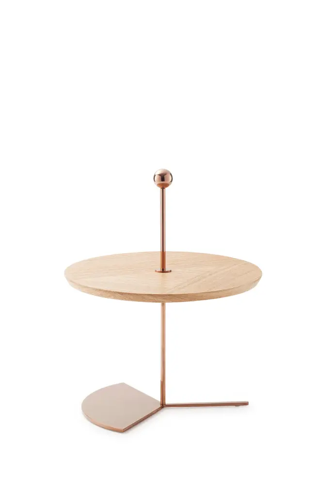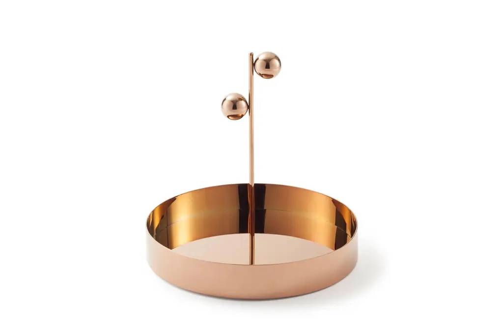 Contemporary trayMeasures: Diameter 30 height 27.5 cmPlated metal coated with glossy pink copper finishFrom Earth, one can only see the portion of the Moon that is illuminated by the Sun. An image that is constantly changing as the Moon orbits the Earth. The collection draws its inspiration from this fascinating connectivity. Round shapes and glistening gold, champagne, copper and pink-copper metal finishes personify the Moon itself while handles and - for the side tables- legs represent the different lunar phases that change according to the positions of the Moon and Sun relative to the Earth. Light over darkness the off the Moon trays and side tables’ collection invite to a lunar dream.