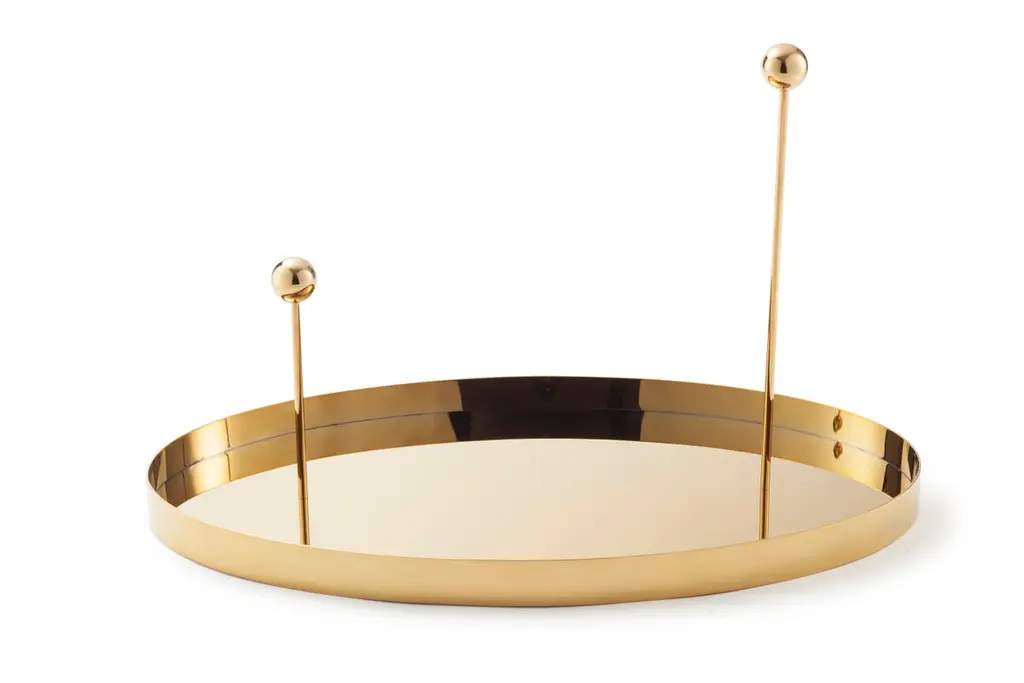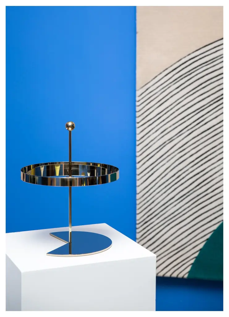 Contemporary cake standMeasures: W 50, D 30, H 24 cmPlated metal coated with glossy Champagne finishFrom Earth, one can only see the portion of the Moon that is illuminated by the Sun. An image that is constantly changing as the Moon orbits the Earth. The collection draws its inspiration from this fascinating connectivity. Round shapes and glistening gold, champagne, copper and pink-copper metal finishes personify the Moon itself while handles and – for the side tables- legs represent the different lunar phases that change according to the positions of the Moon and Sun relative to the Earth. Light over darkness the Off the Moon trays and side tables’ collection invite to a lunar dream.
