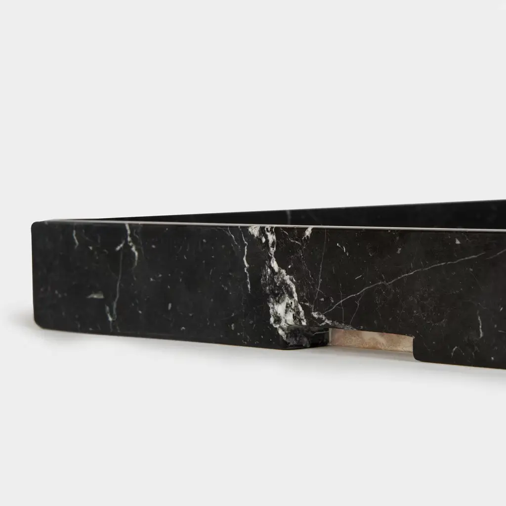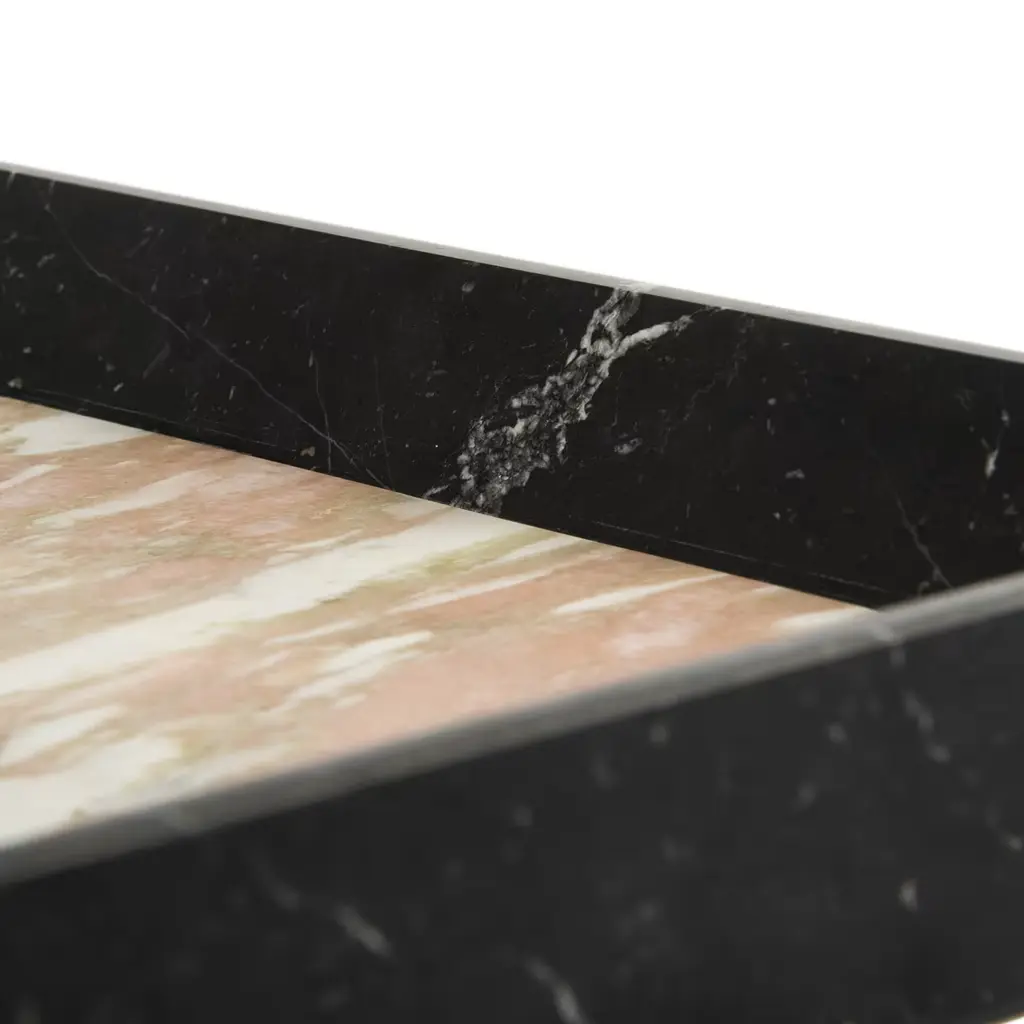 Adding luxury and opulence to a contemporary home, this tray was crafted entirely by hand and boasts a rectangular shape with tall edges and side handles. Its timeless design is elegant and ideal for any occasion. Its background in pink Norvegia marble strikingly contrasts with the edges in black Marquina marble. Surprisingly light and easy to handle and clean, its finish is opaque. Introduced at Milan Design Week 2018, it can be made also in Carrara, Calacatta Carrara, Calacatta Oro, or pink Norvegia with grey Guatemala, Grigio Carnico, or black Marquina edges for a bi-color effect.