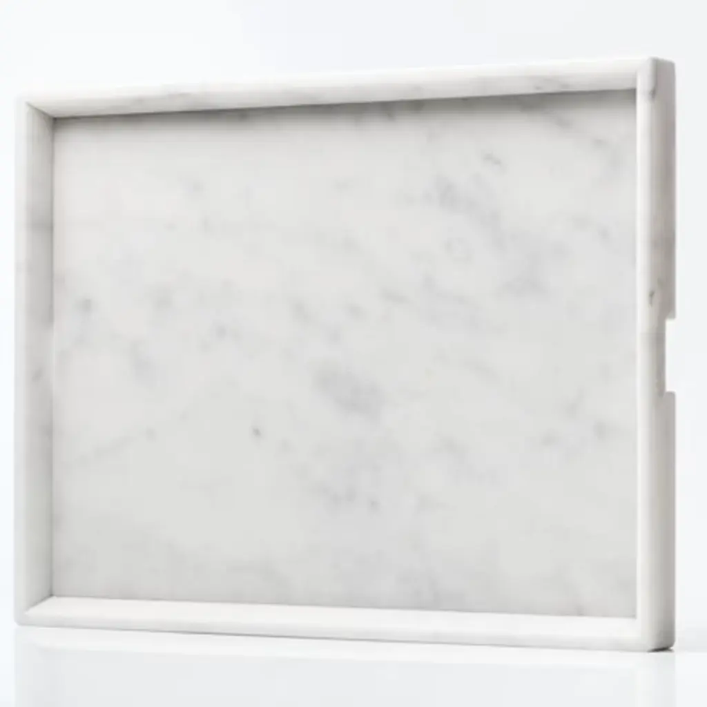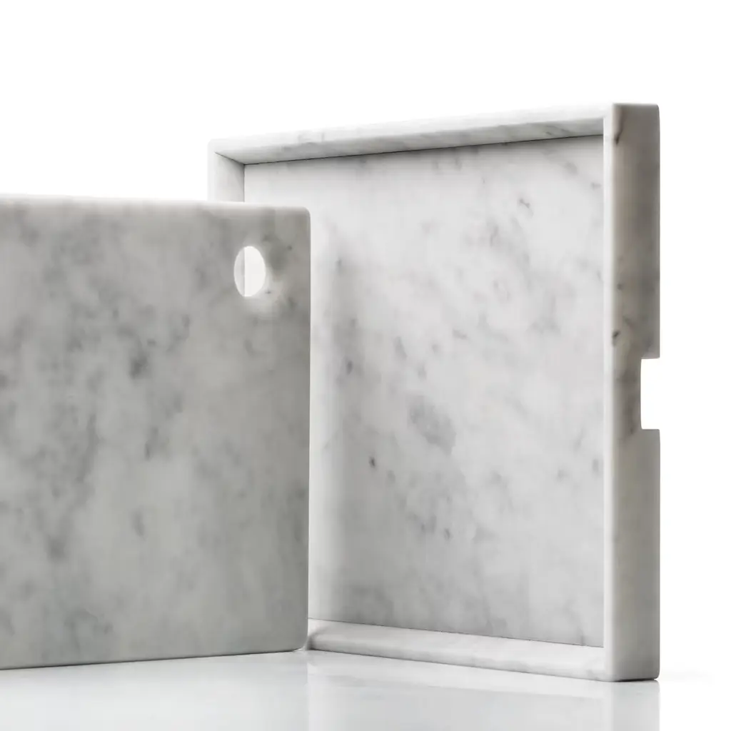 This sophisticated serving tray was made entirely by hand using white Carrara marble. Its pure geometric shape features two semi-circular handles and raised edges to make it easy to carry. The timeless design has an opaque, easy to clean finish and is surprisingly light. The marble can be customized by choosing among Green Guatemala, Grey Carnico, Grey Bardiglio, Calacatta Carrara, Calacatta Oro, Pink Portugal, or Black Marquina. It is possible to have a two-color combination for base and edges, as well as customize the piece with monograms or words. Please ask the concierge for details.