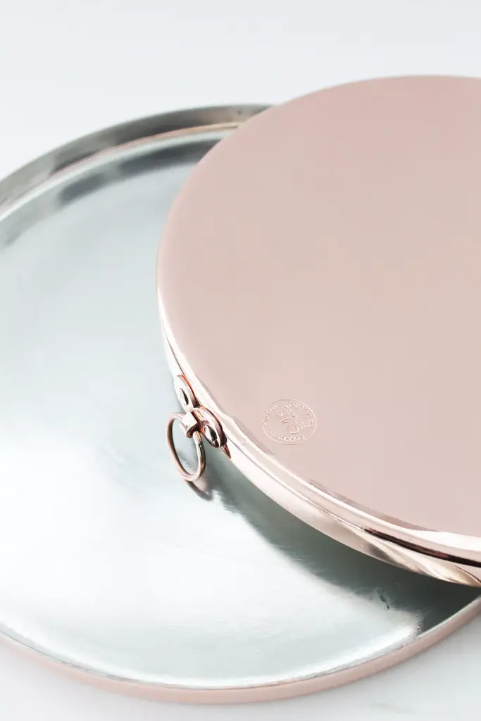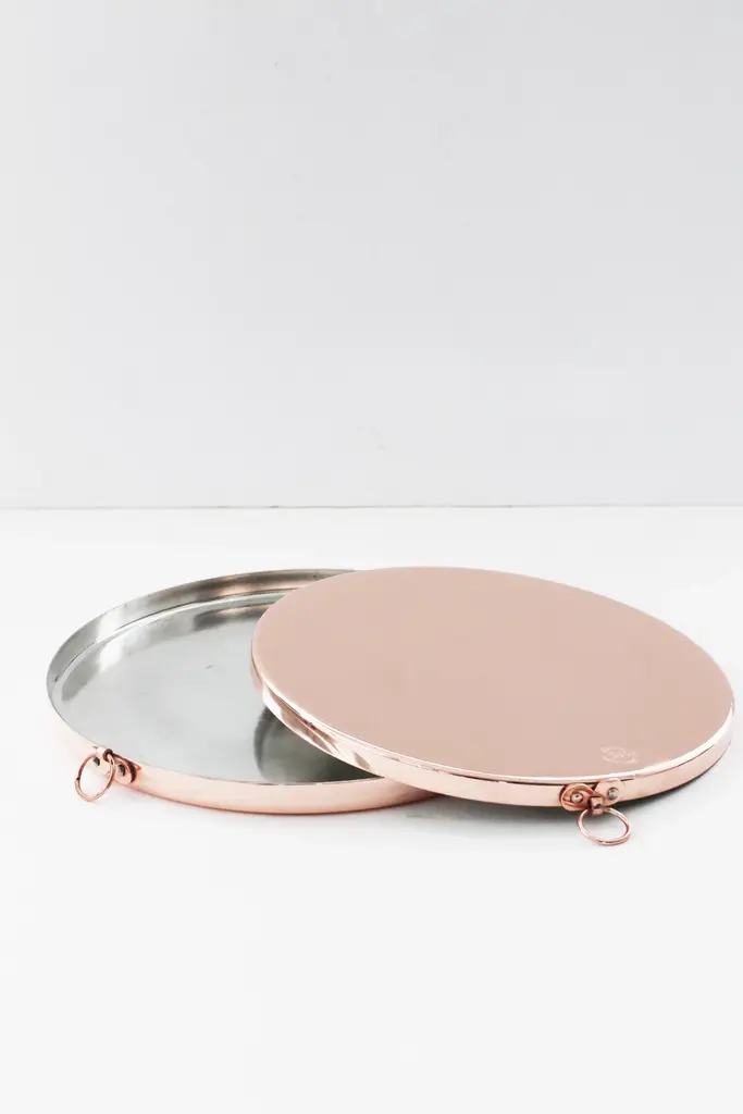 **Please note all sales are final**Inspired by a set of 4 round trays graduated in size from the victorian era and made in England. They were made from such a substantial gauge of copper and functional we had to make them. We designed ours to be exact same copper thickness and in two sizes a 11"diameter and a 12" with hanging ring to display beautifully on the wall like ours. Coppermill Kitchen marries vintage character and modern luxury to source and produce copperwarewith timeless style and functionality. Comprised of antique copperware treasures sourced in historic European towns, as well as new copperware designed with an expert eye for detail, each piece has a story to tell.Coppermill Kitchen is dedicated to finding only unique and special copperware that has both style and a story to tell for generations to come. * Made of Copper & lined with tin* Care instructions included with item.* Made In Turkey#### *Dimensions** Medium 11"Diameter * Large 12"Diameter