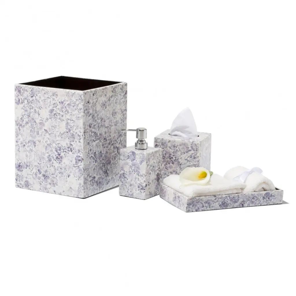 - Handcrafted vanity tray made of wood and seashell from Colombia. - Varying shades of lavender and blue seashell contrast on a light backdrop, and are complimented by a high-gloss lacquer finish.