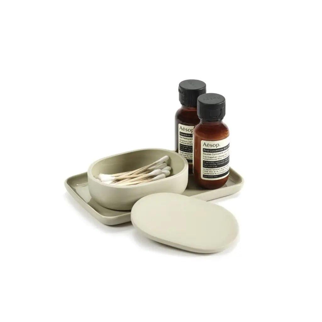 The Serax Cose plate offers an easy way to give your bathroom or kitchen a quick yet luxurious touch-up: it makes the perfect soap dish or tray for jewelry. However, it is also suitable for the kitchen to be used as a serving dish, for example. On the inside, the tray is covered with a glossy glaze, but the outside is unglazed, beautifully emphasizing the tray’s handmade feel. The small Cose tray is part of the eponymous collection designed by Bertrand Lejoly, consisting of objects that are suitable for small storage needs in the bathroom, kitchen and office. The design language of the porcelain items is charmingly simple, but by no means clinical – the rounded edges and unglazed outer surface add a touch of softness to the design. “The accessories are present, but at the same time, they are subtly adapted to any interior style, from modern to classic,” Lejoly has said.