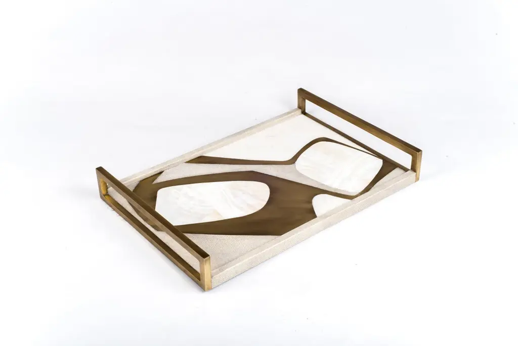 The Paris based label has distinguished themselves since their launch, with their iconic use of shagreen mixed with brass and other exotic materials. All furniture is handcrafted by skilled artisans, ultimately making each piece unique, designed in Paris and produced in the Philippines.The Cosmos rectangle tray is a stunning tabletop piece for any space. Available in light or dark color way inlaid in a mixture of shagreen, pen shell and bronze-patina brass. Also available on a circular tray.Measures: 24 x 13.5 x 2"All R & Y Augousti pieces are handmade by artisans, ultimately making each piece unique.Wipe clean with soft dry cloth.Acclaimed design duo Ria & Yiouri Augousti have established themselves since the 1990s as pioneers of modern-vintage style through their luxurious Art Deco inspired collections.The Paris based label has distinguished themselves since their launch, with their iconic use of shagreen mixed with brass and other exotic materials. All furniture is handcrafted by skilled artisans, ultimately making each piece unique. All shagreen-covered items should be kept out of direct sunlight, color variants may occur on the stingray and other exotic finishes, but this showcases the Parisian label's commitment to creating authentic luxurious products using natural components.
