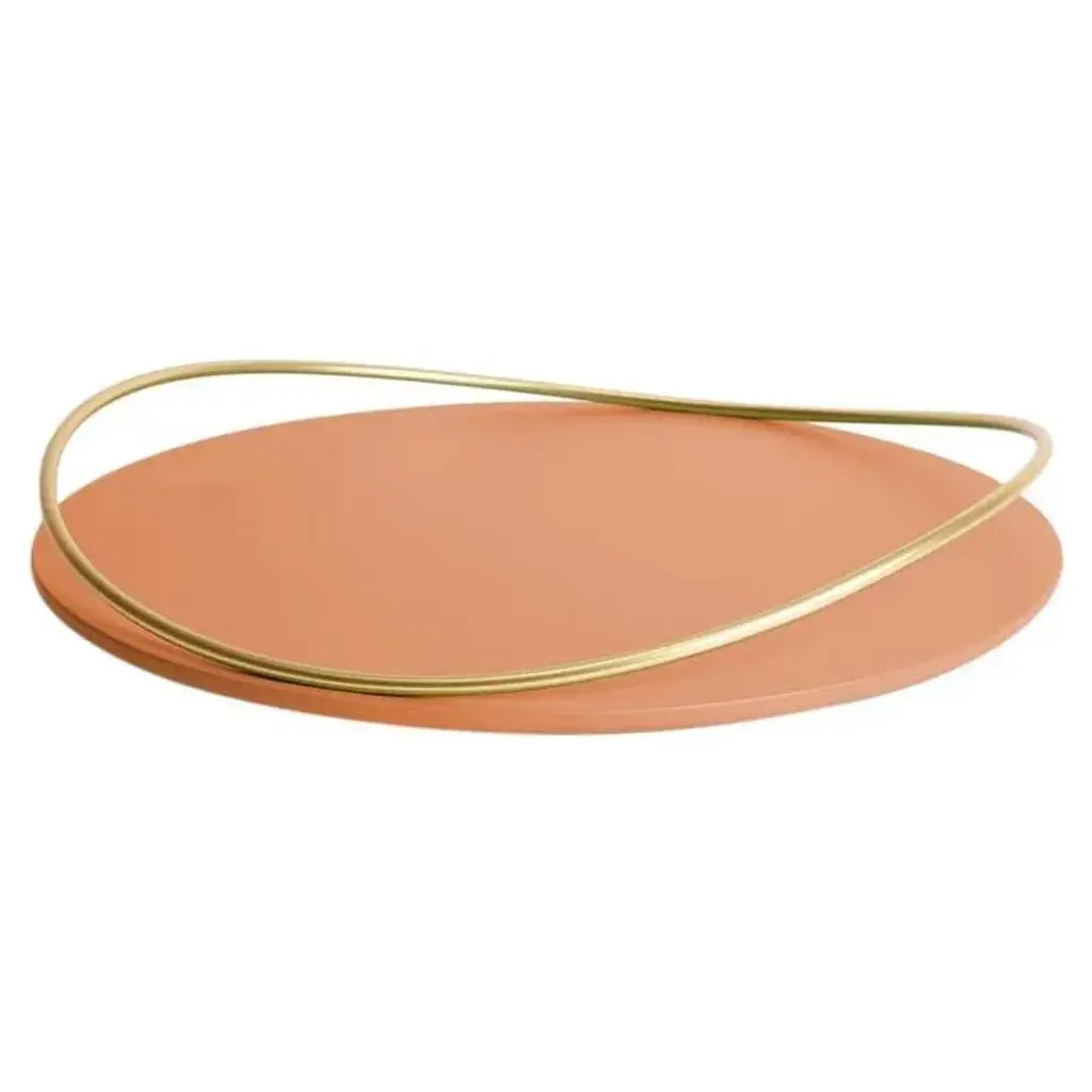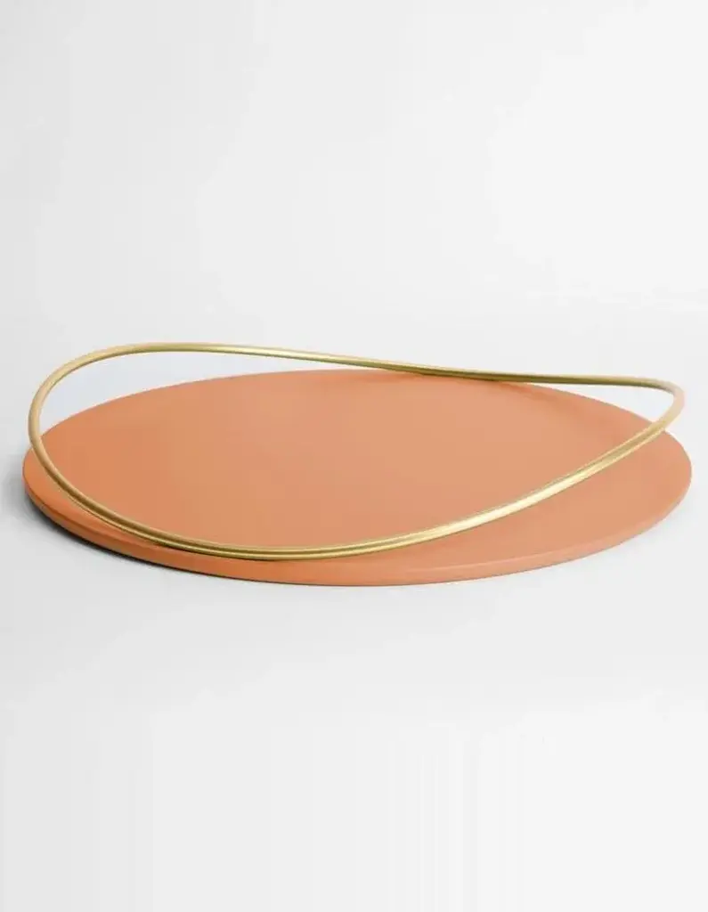 Cotto touché a tray by mason editions dimensions: 36 × 36 × 4.4 cm materials: iron and mdf colours: taupe, cotto, burgundy, sage green, petrol green a light metal rod that rests on the surface and then lifts up, almost touching the surface with a quick tap, a movement that defines the handles of touché trays. The organic shape of the round base communicates with the thin tubular, giving the impression of a perpetual undulatory motion, which seems to vanish when the trays are looked at from above. This small round tray with a small round handle is multi-functional, with a classic design that suits any decor. The round mdf base is available in several colours, with a slim handle in galvanized 24k gold. From serving drinks and canapés or as a refined centrepiece to display small objects and candles, it’s a must-have furnishing accessory.