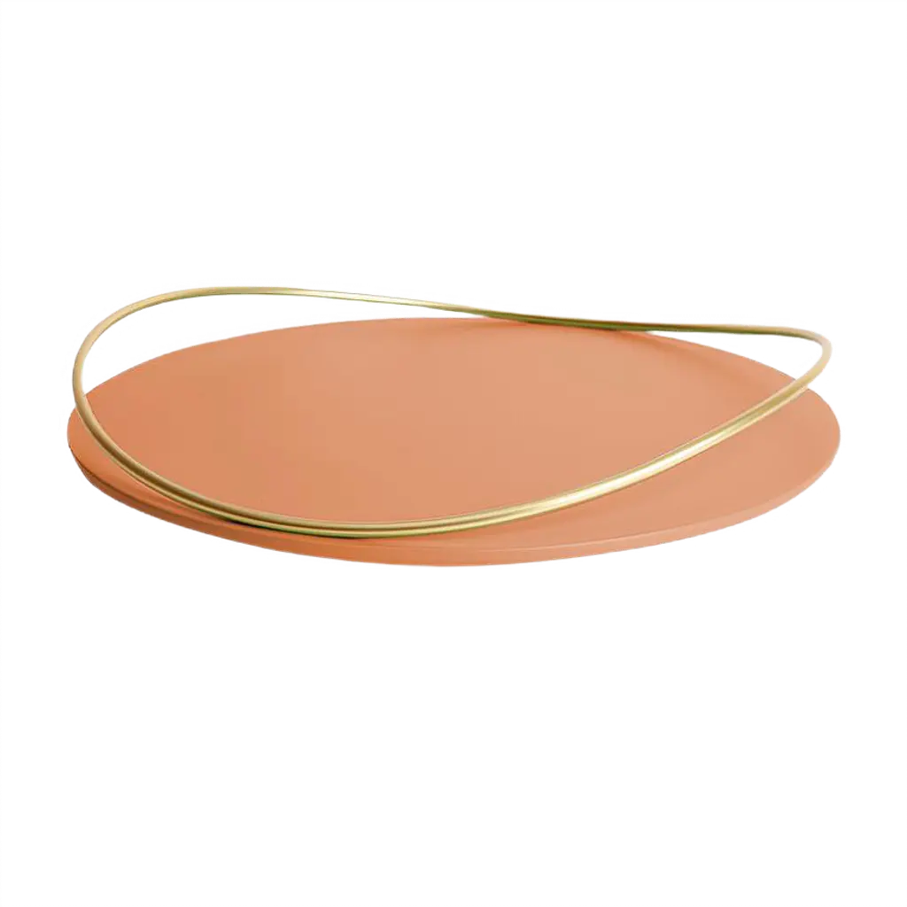 Cotto Touché B tray by Mason EditionsDimensions: 36 × 47 × 6.7 cmMaterials: Iron and MDFColours: taupe, cotton, burgundy, sage green, petrol greenA light metal rod that rests on the surface and then lifts up, almost touching the surface with a quick tap, a movement that defines the handles of Touché trays.The organic shape of the round base communicates with the thin tubular, giving the impression of a perpetual undulatory motion, which seems to vanish when the trays are looked at from above.This small round tray with an oval handle won’t go unnoticed in the eyes of your party and dinner guests.The round MDF base is available in several colours, with a slim handle in galvanized 24k gold. A versatile design object, used to serve food and drinks as well as display jewellery and bedroom vanity.Mason Editions is an Italian company specialized in the production of design furniture, lighting solutions, and accent pieces. Born from the lifelong passion for lighting and entrepreneurial spirit of Fabio and his partner Silvia, Mason Editions places itself halfway between fine art and exquisite craftsmanship. A collection of lighting, design objects, and furnishing accessories, signed by artists Serena Confalonieri, Martina Bartoli, and Matteo Fiorini, head of the creative direction.Mason Editions comes from the experience of an Italian lighting company placed in the Veneto region.This new brand of furniture elements was born from the meeting between the entrepreneur Fabio Mason and three international designers who designed the first collection for a sophisticated public. Therefore the collection wants to be eclectic and timeless.The material contrast and fresh design, with essential shapes, mark the mason editions collection.In conclusion, the elegant Italian sign highlights proposals suitable for all environments.Mason editions is a set of experiences, artisans, and productive know-how that creates a capable system.
