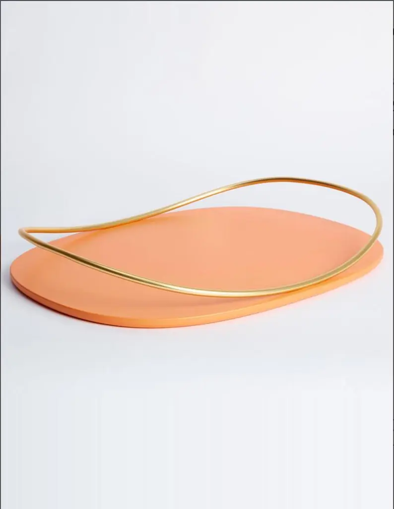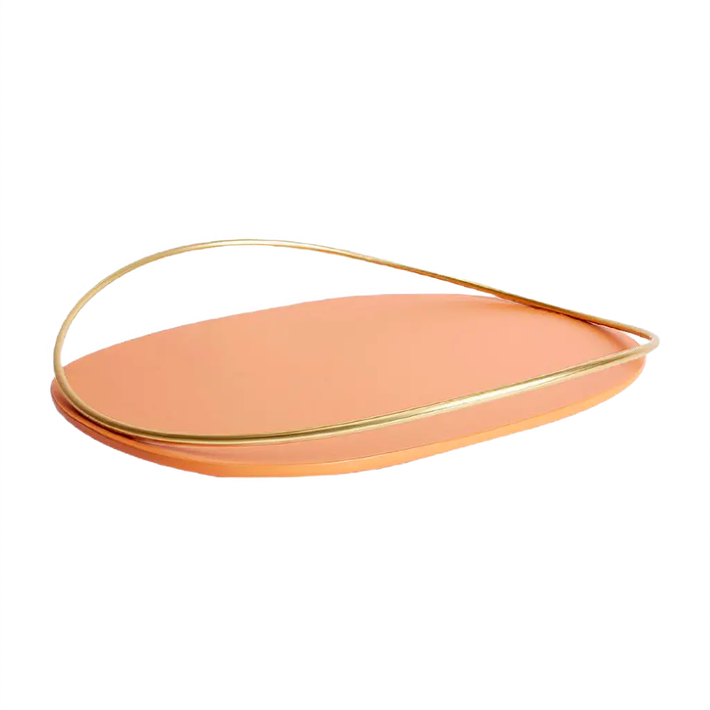 Cotto Touché C tray by Mason EditionsDimensions: 36 × 48 × 6.4 cmMaterials: Iron and MDFColours: Taupe, cotto, burgundy, sage green, petrol green.A light metal rod that rests on the surface and then lifts up, almost touching the surface with a quick tap, a movement that defines the handles of Touché trays.The organic shape of the oval base communicates with the thin tubular, giving the impression of a perpetual undulatory motion, which seems to vanish when the trays are looked at from above.This oval tray with an oval handle won’t go unnoticed in the eyes of your party and dinner guests.The round MDF base is available in several colours, with a slim handle in galvanized 24k gold. A versatile design object, used to serve food and drinks as well as display jewellery and bedroom vanity.Mason Editions is an Italian company specialized in the production of design furniture, lighting solutions, and accent pieces. Born from the lifelong passion for lighting and entrepreneurial spirit of Fabio and his partner Silvia, Mason Editions places itself halfway between fine art and exquisite craftsmanship. A collection of lighting, design objects, and furnishing accessories, signed by artists Serena Confalonieri, Martina Bartoli, and Matteo Fiorini, head of the creative direction.Mason Editions comes from the experience of an Italian lighting company placed in the Veneto region.This new brand of furniture elements was born from the meeting between the entrepreneur Fabio Mason and three international designers who designed the first collection for a sophisticated public. Therefore the collection wants to be eclectic and timeless.The Material contrast and fresh design, with essential shapes, mark the mason editions collection.In conclusion, the elegant Italian sign highlights proposals suitable for all environments.Mason editions is a set of experiences, artisans, and productive know-how that creates a capable system.