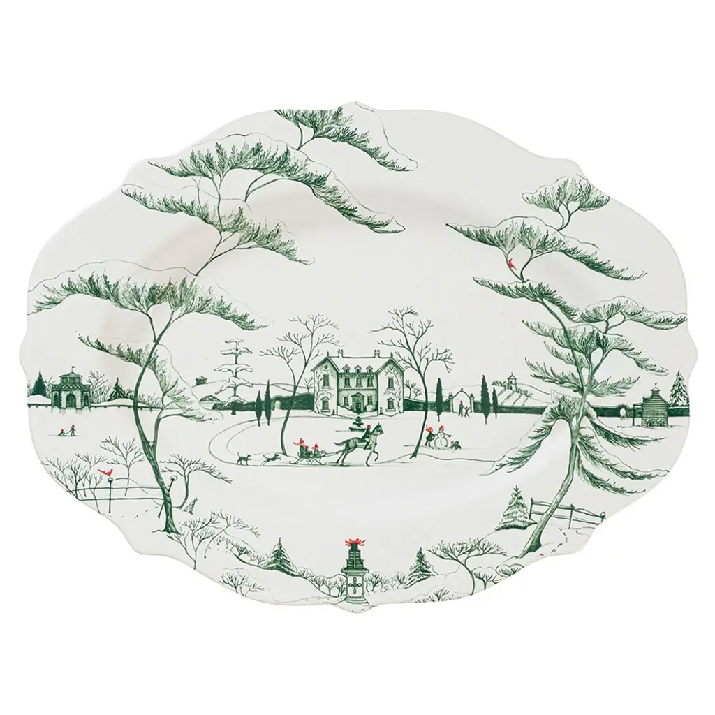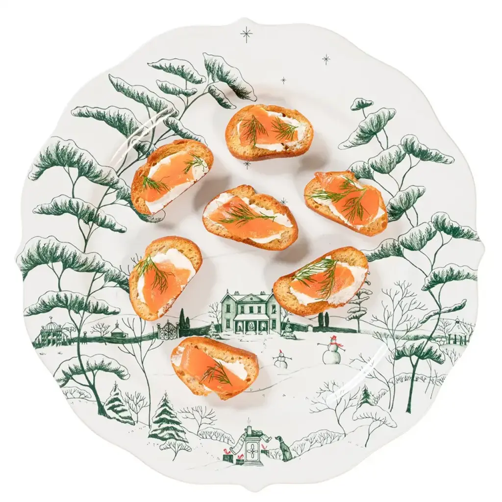 The Country Estate is covered in snow and illustrated in festive evergreen upon a crisp white backdrop with joyful winter pursuits like horse-drawn sleigh rides and building snowmen. Extra special details include the stunning scalloped rim and merry little pops of crimson accents. Perfect for displaying appetizers, sweets, trinkets or holiday cards all season long. Mrs. Claus loves it as a beautiful resting place for her spectacles, after a long night by the fire checking her lists and sipping sherry. Based in Connecticut, Juliska is committed to bringing elegant European design into our modern homes. Since its founding in 2001, when David and Capucine Gooding began by working with artisans outside of Prague to reproduce antique Bohemian glass pieces, every piece from Juliska has shared a rich heritage spanning six centuries of European design. Juliska's creations are timeless, romantic and effortlessly chic.
