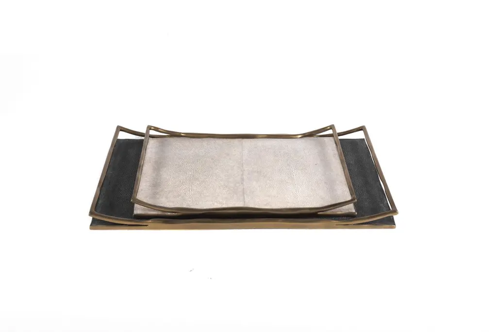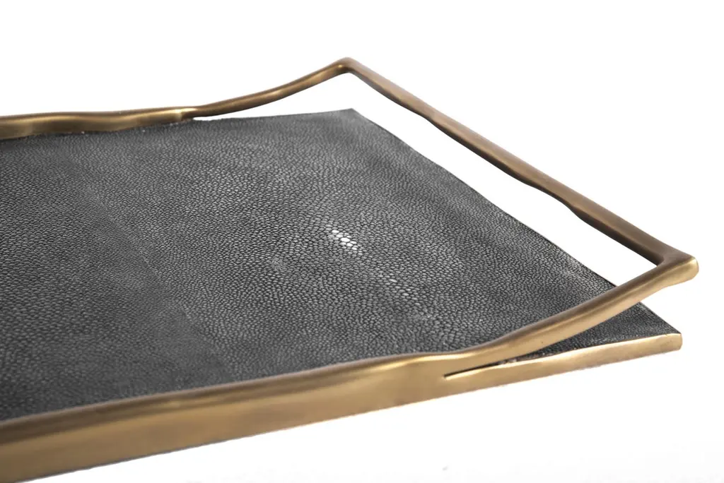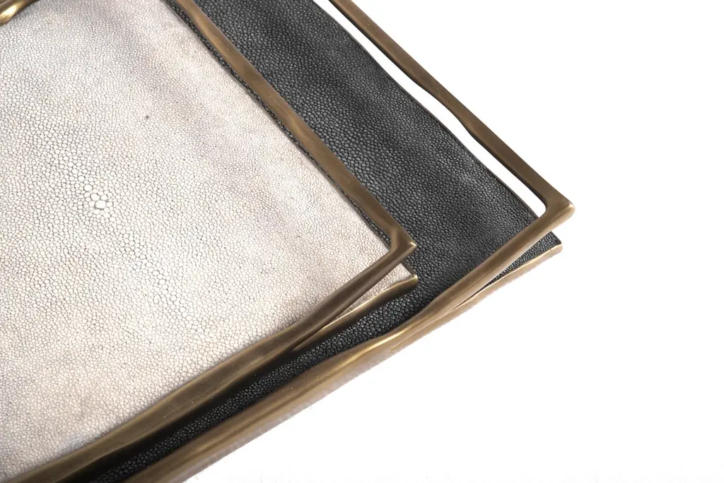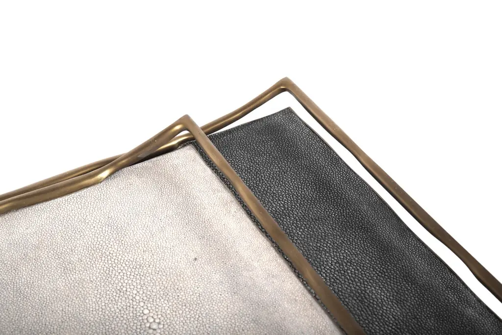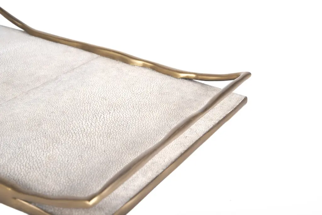 The Paris based label has distinguished themselves since their launch, with their iconic use of shagreen mixed with brass and other exotic materials. All furniture is handcrafted by skilled artisans, ultimately making each piece unique, designed in Paris and produced in the Philippines.The melting tray comes in two sizes and two color variants. This listing is for the medium size in cream shagreen. The irregular surfaced bronze-patina brass handles, frame the tray in a beautiful & sculptural way.Measures: Large 58.5 x 34.5 x 4.5 cm, medium 43 x 30.5 x 4.5 cmAll R & Y Augousti pieces are handmade by artisans, ultimately making each piece unique.Wipe clean with soft dry cloth.Acclaimed design duo Ria & Yiouri Augousti have established themselves since the 1990s as pioneers of modern-vintage style through their luxurious Art Deco inspired collections.The Paris based label has distinguished themselves since their launch, with their iconic use of shagreen mixed with brass and other exotic materials. All furniture is handcrafted by skilled artisans, ultimately making each piece unique. All shagreen-covered items should be kept out of direct sunlight, color variants may occur on the stingray and other exotic finishes, but this showcases the Parisian label's commitment to creating authentic luxurious products using natural components.