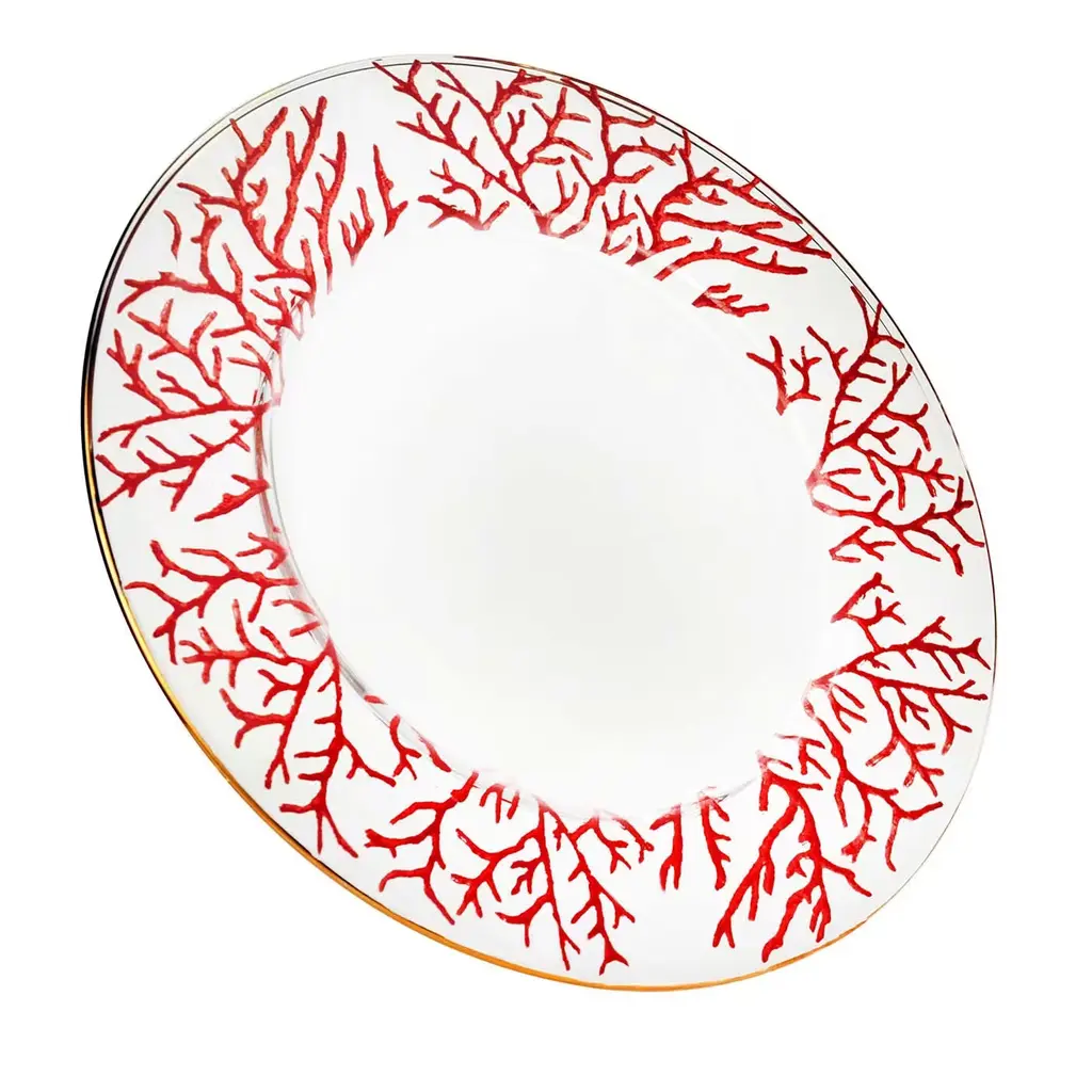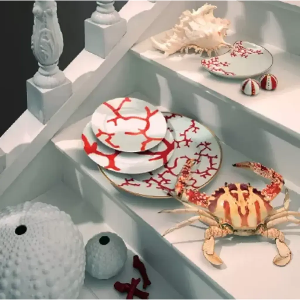 An Alberto Pinto design for Raynaud, each piece in the Cristobal dinnerware set is handmade in France from Limoges porcelain. These coral pattern dishes add style and grace to any table. Five-piece place setting includes dinner plate with wide band/plain center, salad plate with coral center, bread/butter plate, tea cup, and saucer. Raynaud was established in 1849 and is the only survivor of 11 porcelain factories existing in Limoges, France. After years of research, Raynaud discovered techniques to create infinite combinations of fade-resistant decorations that is still used by porcelain makers. Boasting a client list of numerous presidents to Princess Diana, Raynaud has been the synonym of quality, known and recognized on every continent.