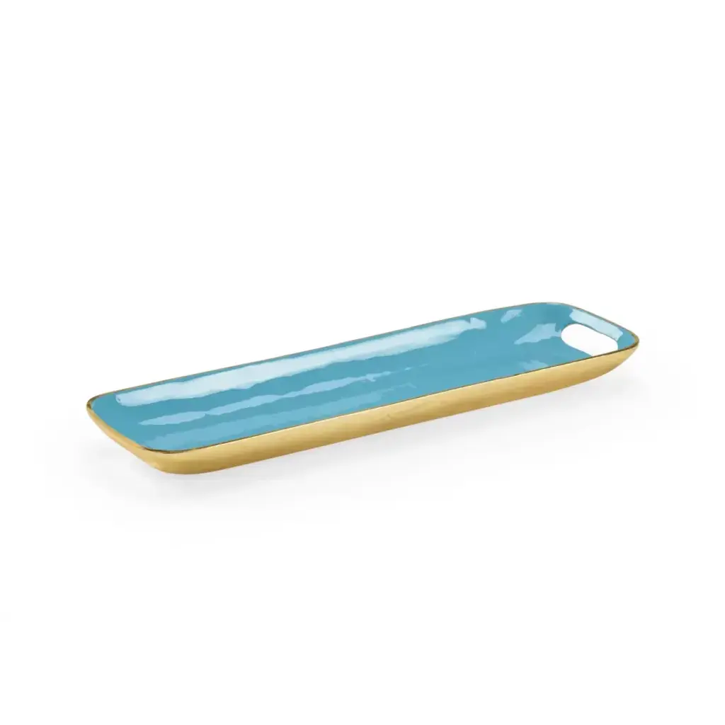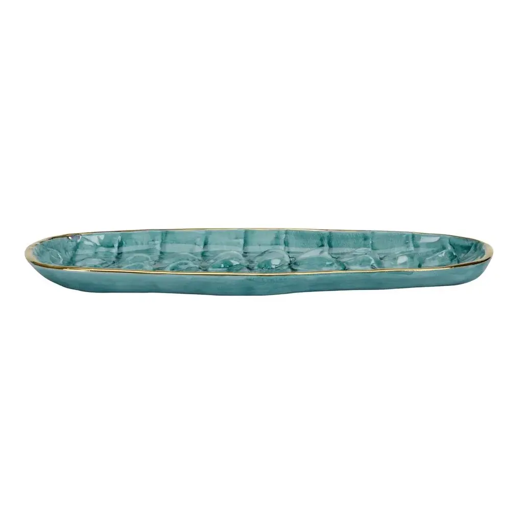 Handcrafted in Italy, this beautiful tray boasts eye-catching texture highlighted by turquoise glaze and a metallic gold trim.
