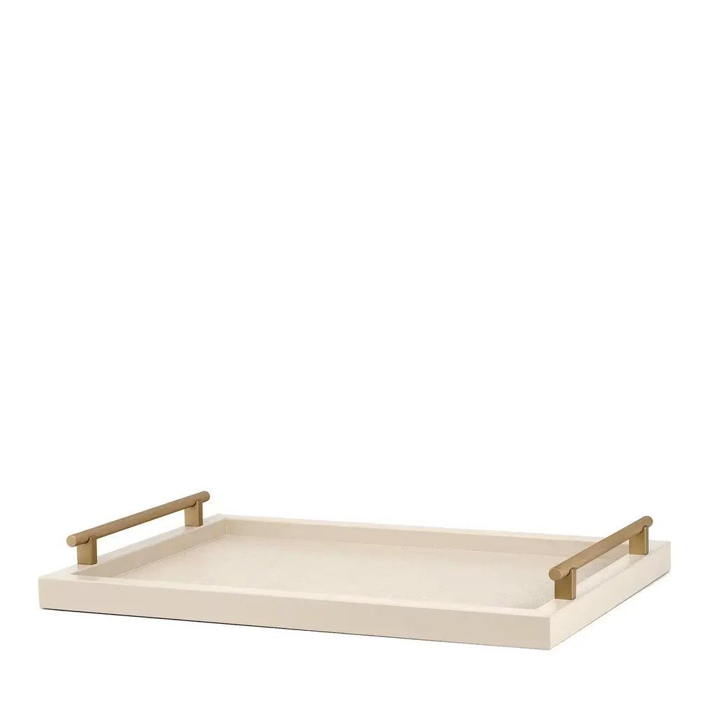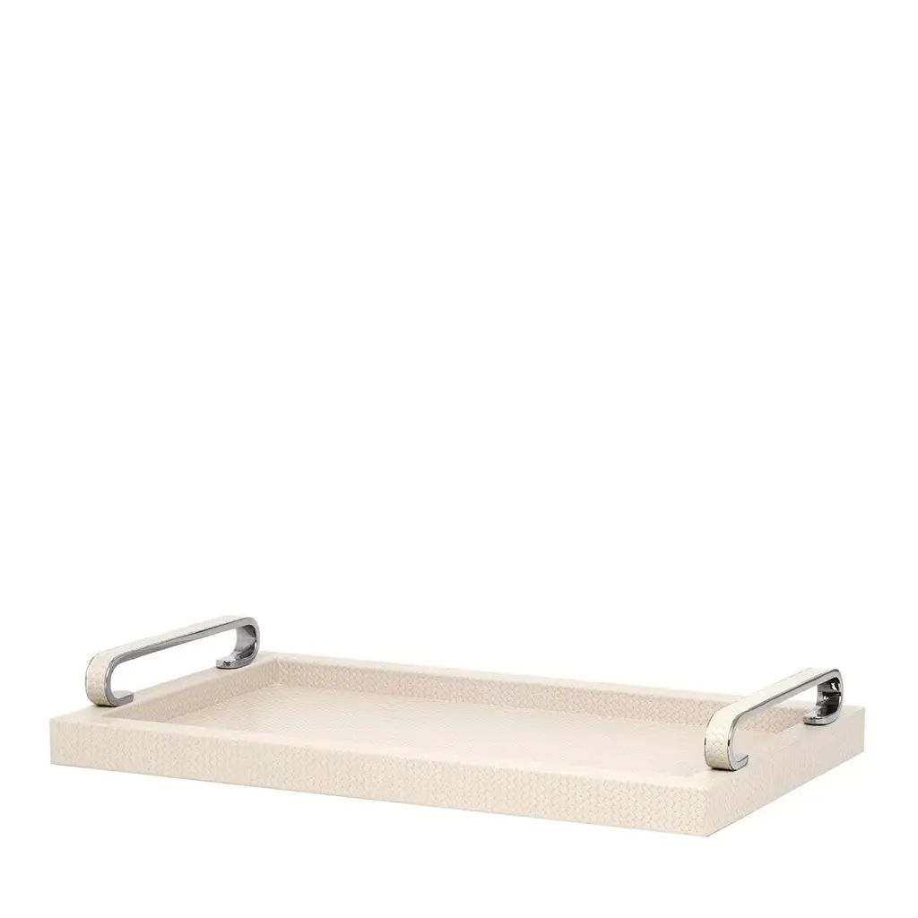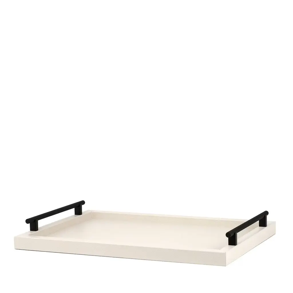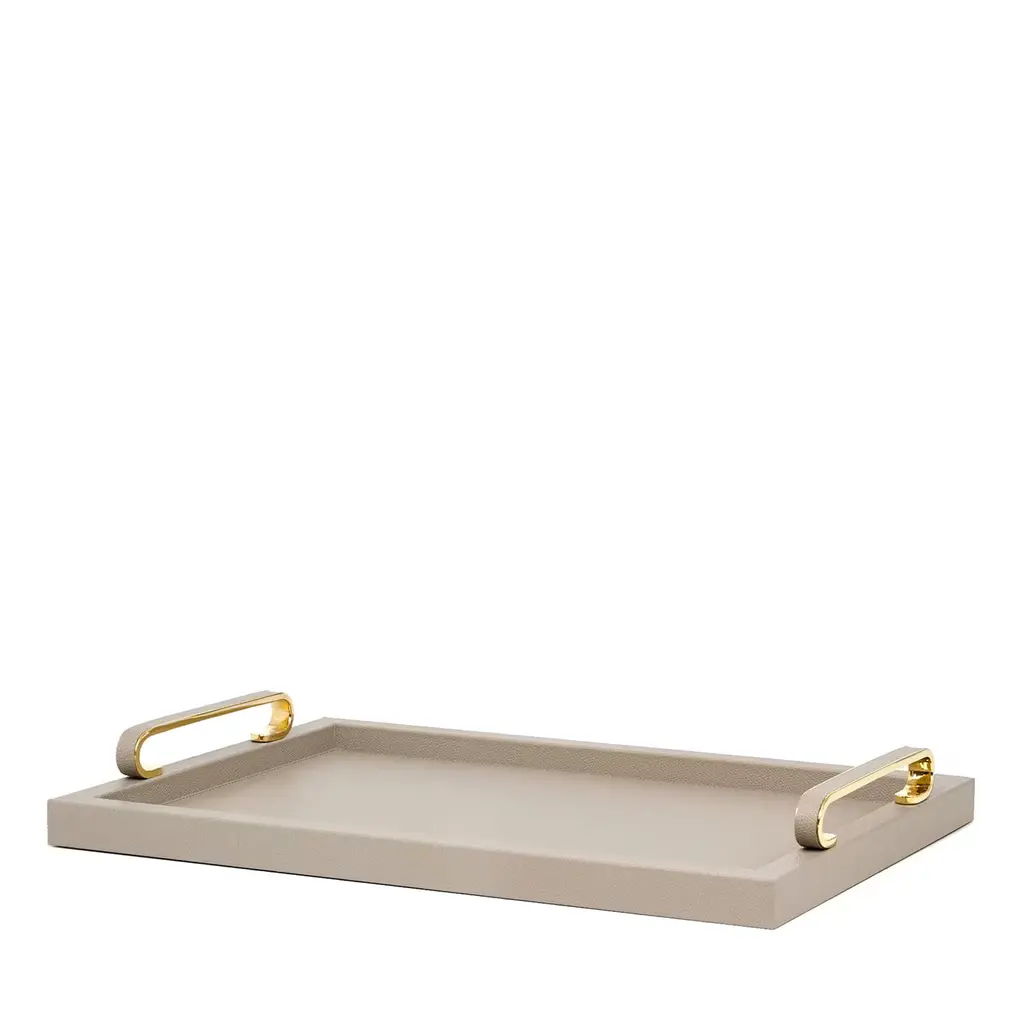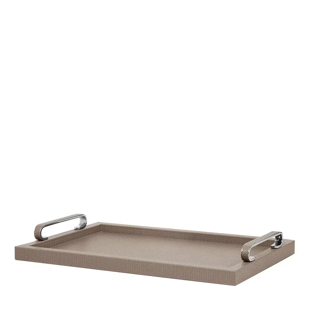 Elegant and minimalist, this tray is a sophisticated addition to a modern dining room to serve drinks and small food. Also apt to permanently display candles or small sculptures, it features a wooden structure entirely upholstered in genuine, gray-hued calfskin. The two linear handles with cylindrical grips are offered in a deep black tone for a dash of bold character and chromatic depth. Widely customizable in finish and color tone upon request to the Concierge. Other sizes available.