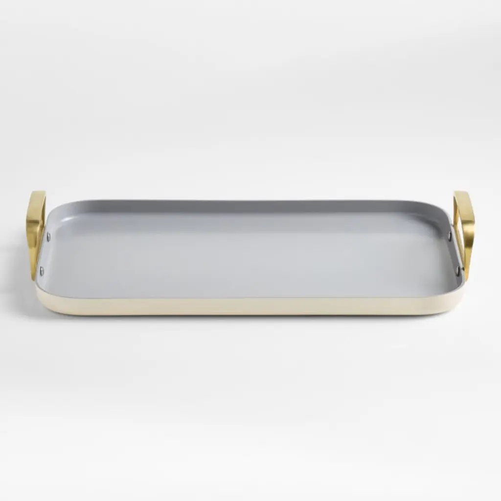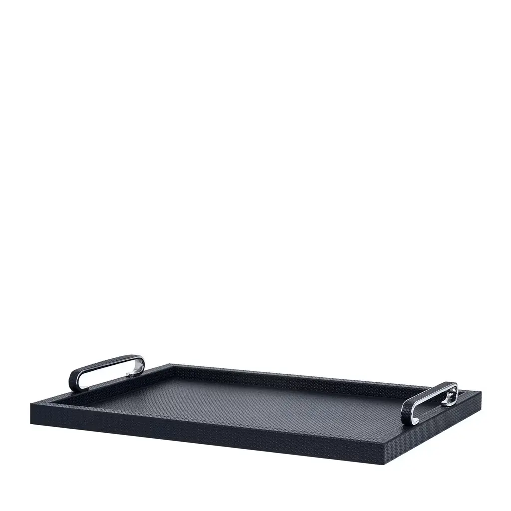 Part of the Dafne Collection, this modern tray features a wooden structure covered in taupe calfskin, with a captivating, partial texture reminiscent of dunes brushed by the wind. Two streamlined metal handles distinguished by a satin gold finish (also black upon request) complement the texture of the leather. An exquisite addition to any home, this piece is available in multiple sizes, hues, and finishing options, please consult the Concierge.