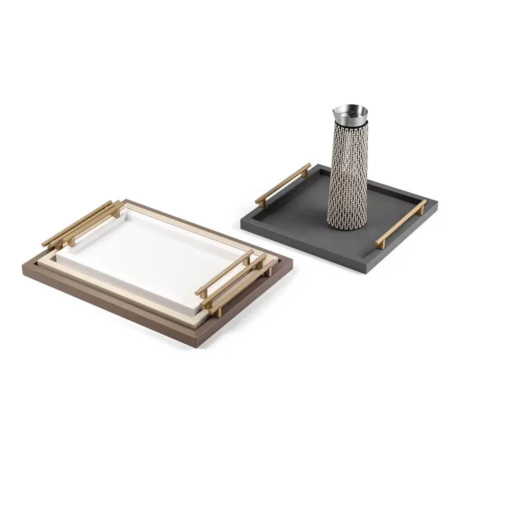 In this sophisticated tray, the timeless elegance of delicate, neutral hues meets the luxury feel exuded by prized calfskin, here featured in a soft beige shade as integral upholstery for the wooden frame. Streamlined handles in a satin gold finish display a softly knurled look and subtly luminous finish that can be found only in the most exclusive items. A pleasant texture reminding of sandhills embellishes the inner bottom. Please ask the Concierge for other sizes and finishing options.