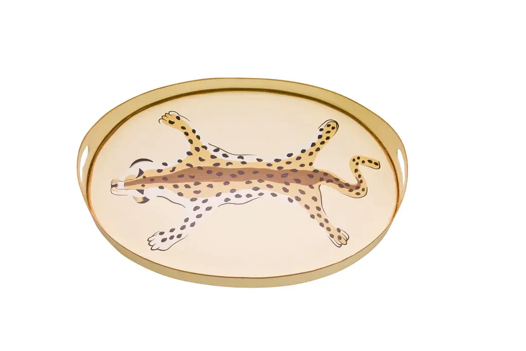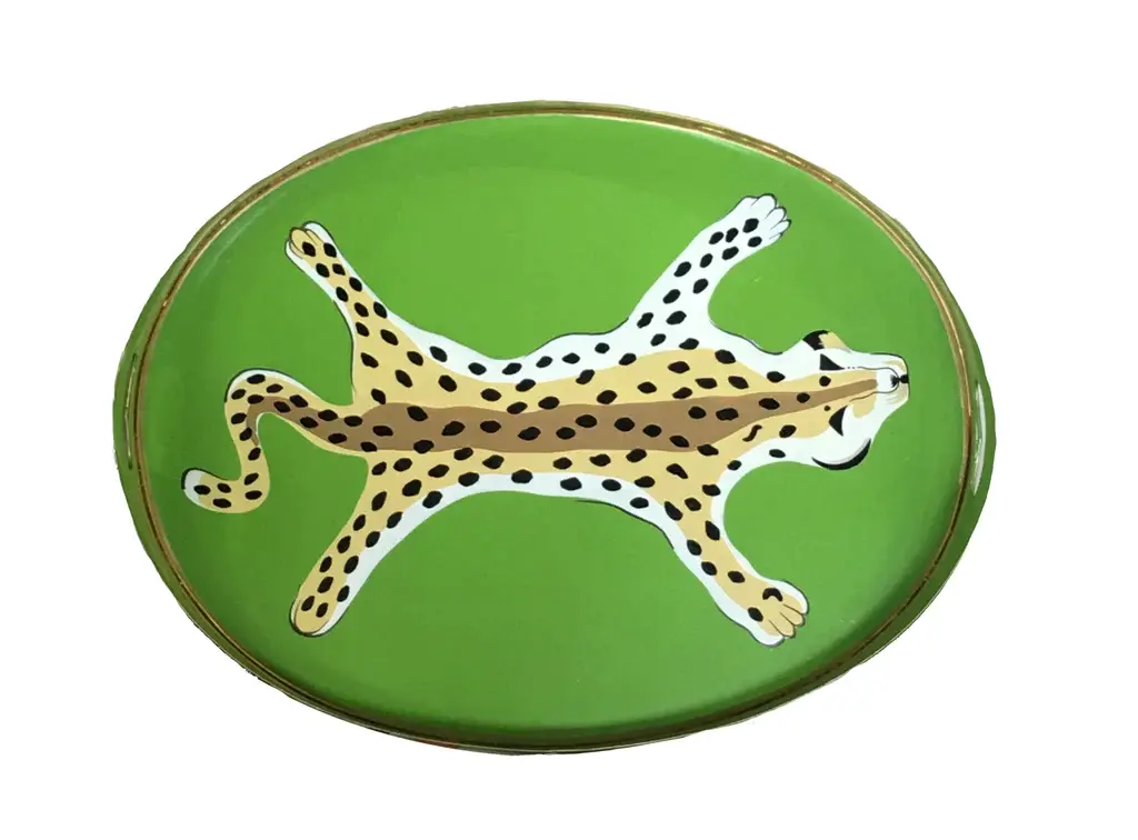 Perfectly sized for entertaining and beautiful enough for everyday display, this oval tray by Dana Gibson shows off a vibrant pink, green, or navy finish and central leopard motif. Handles on the sides make it easy to carry.