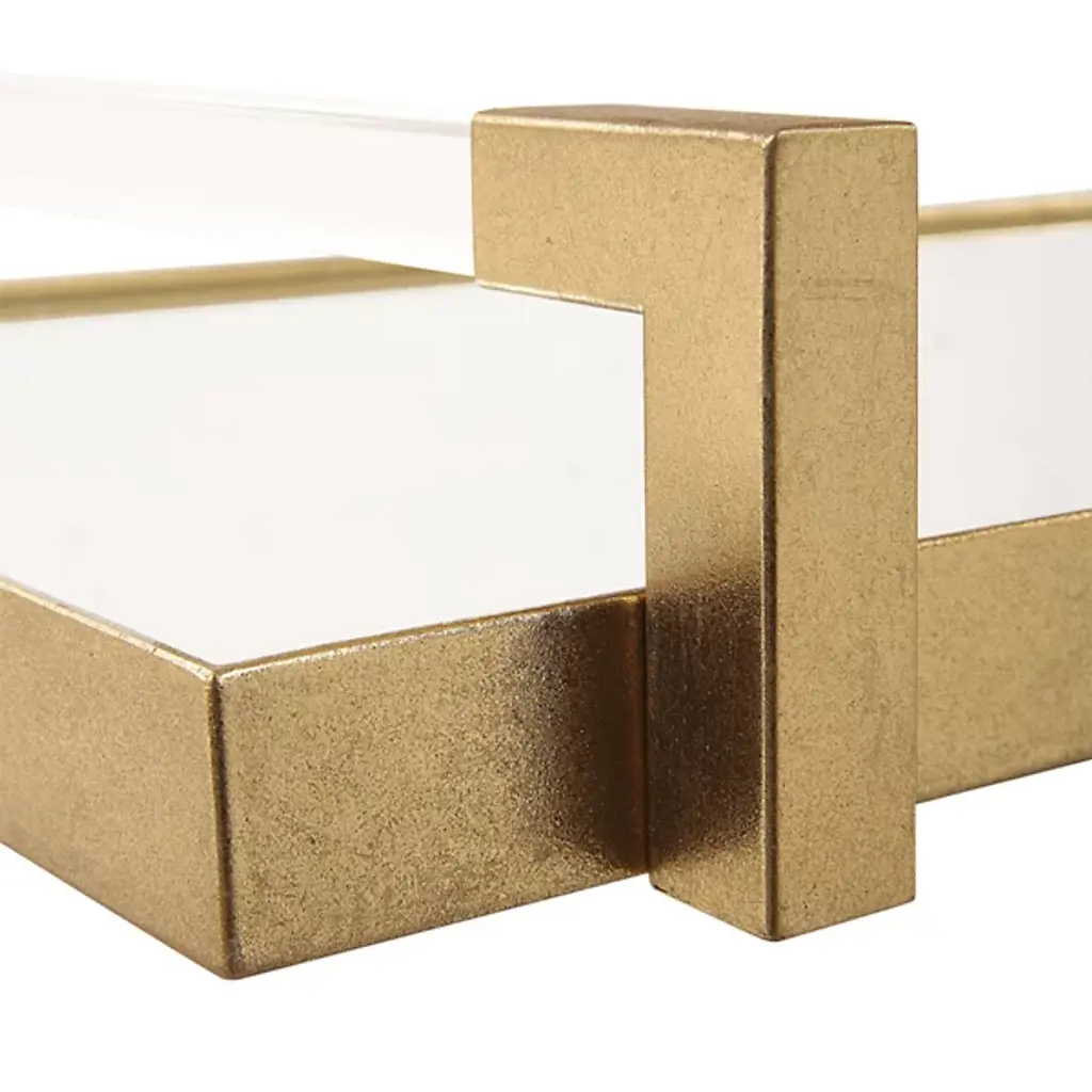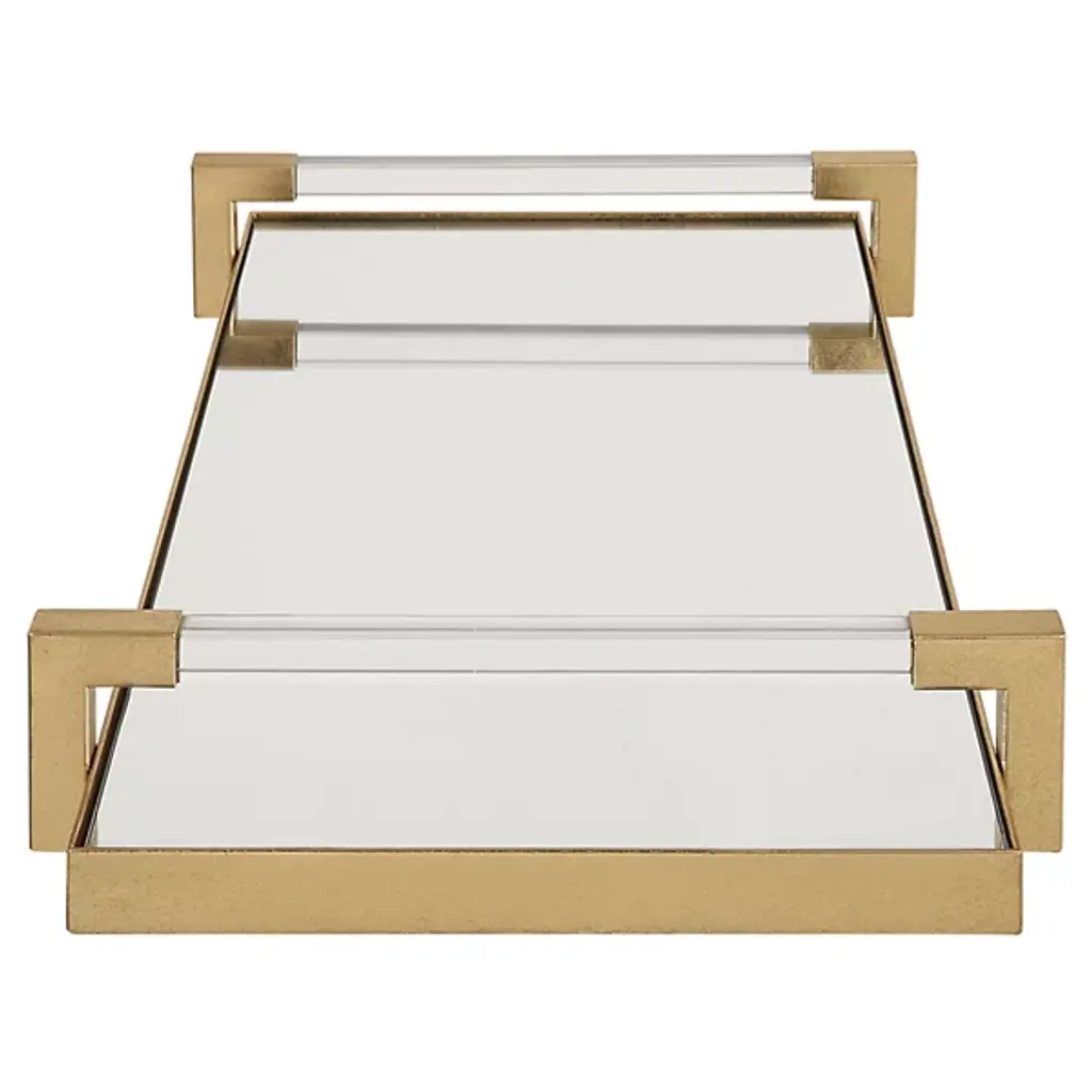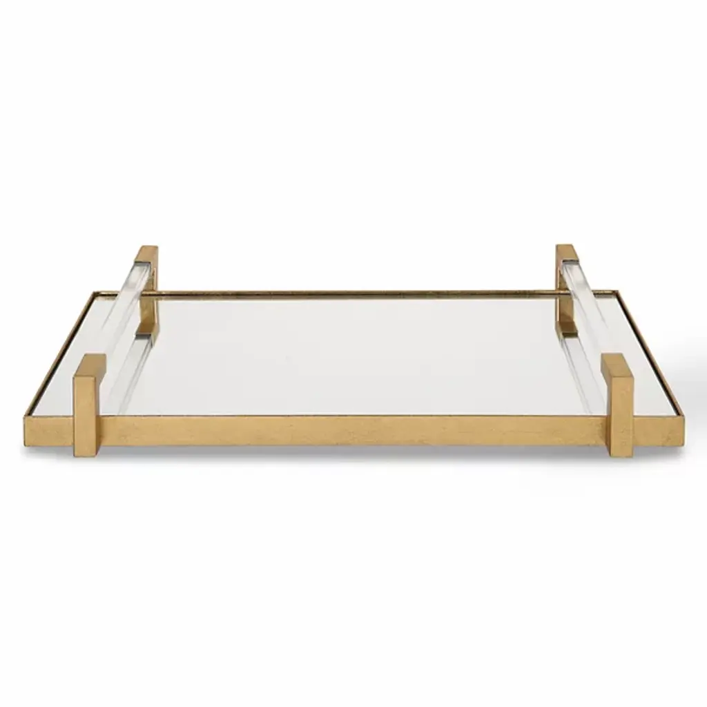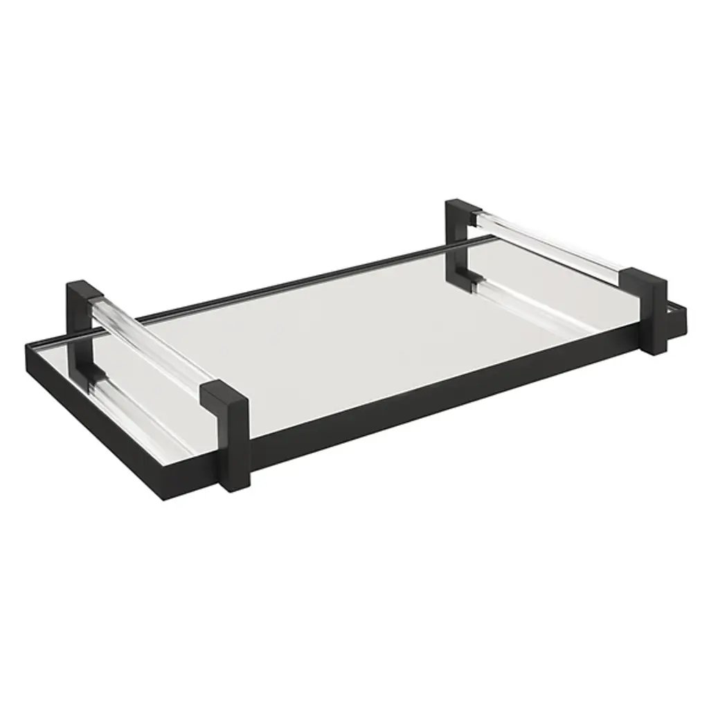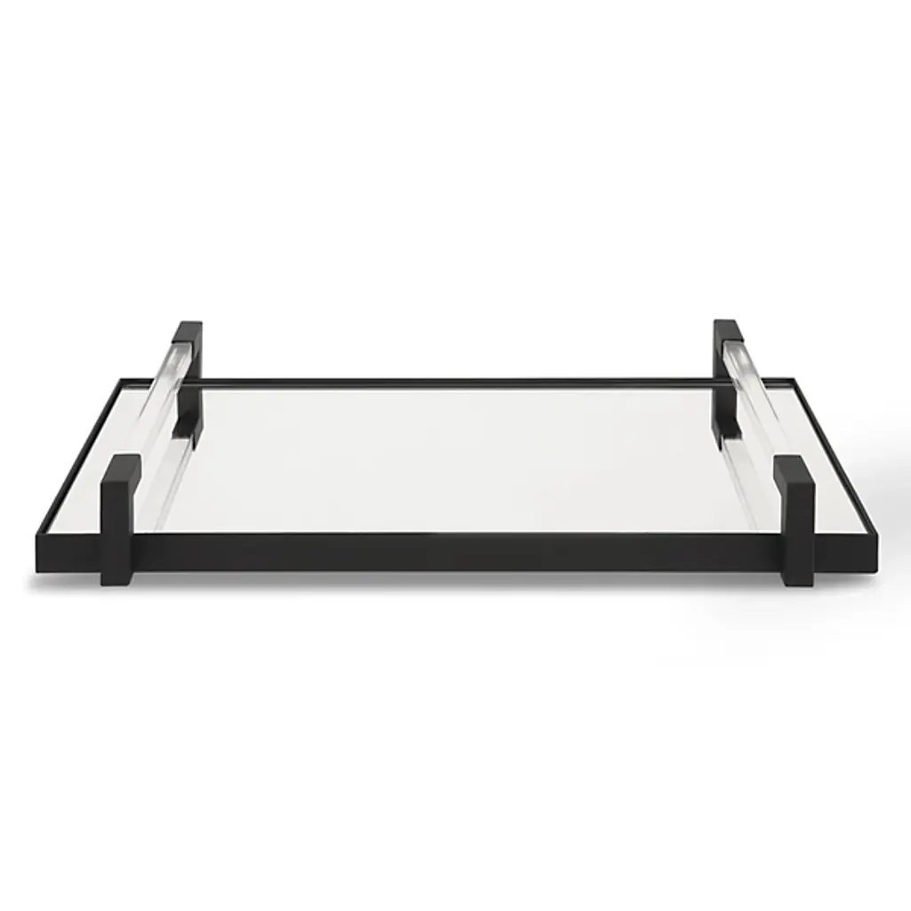 The Deki Tray from Uttermost pairs hand-forged iron with reflective elements for practical serving with a modern sensibility. The matte frame creates strong linear boundaries while clear acrylic square bars suspend across the tray. The mirror interior multiplies light and reflects contents, creating visual expansion within the defined space. This serving piece balances industrial strength with delicate reflective qualities, making it suitable for both functional use and decorative display when not in service.