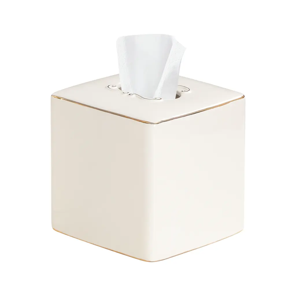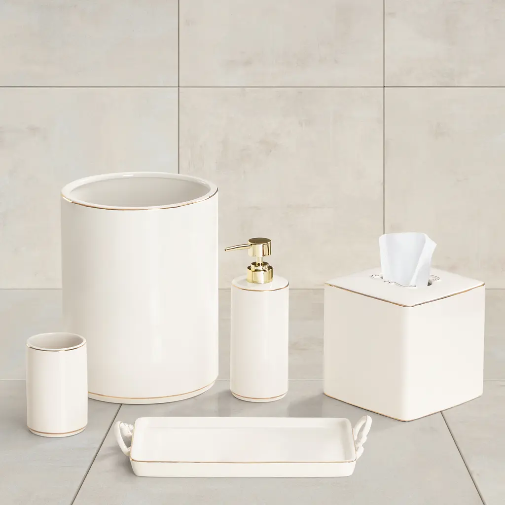 Add timeless elegance to your bathroom decor with the Delphine stoneware bath accessories. Featuring a glossy ivory finish and delicate gold trim, this set offers a sophisticated touch. Perfect for creating a polished, coordinated look while keeping your essentials stylishly organized. The Delphine Bath Accessories collection consists of a lotion/soap dispenser, tumbler, vanity tray, wastebasket, and tissue box cover.