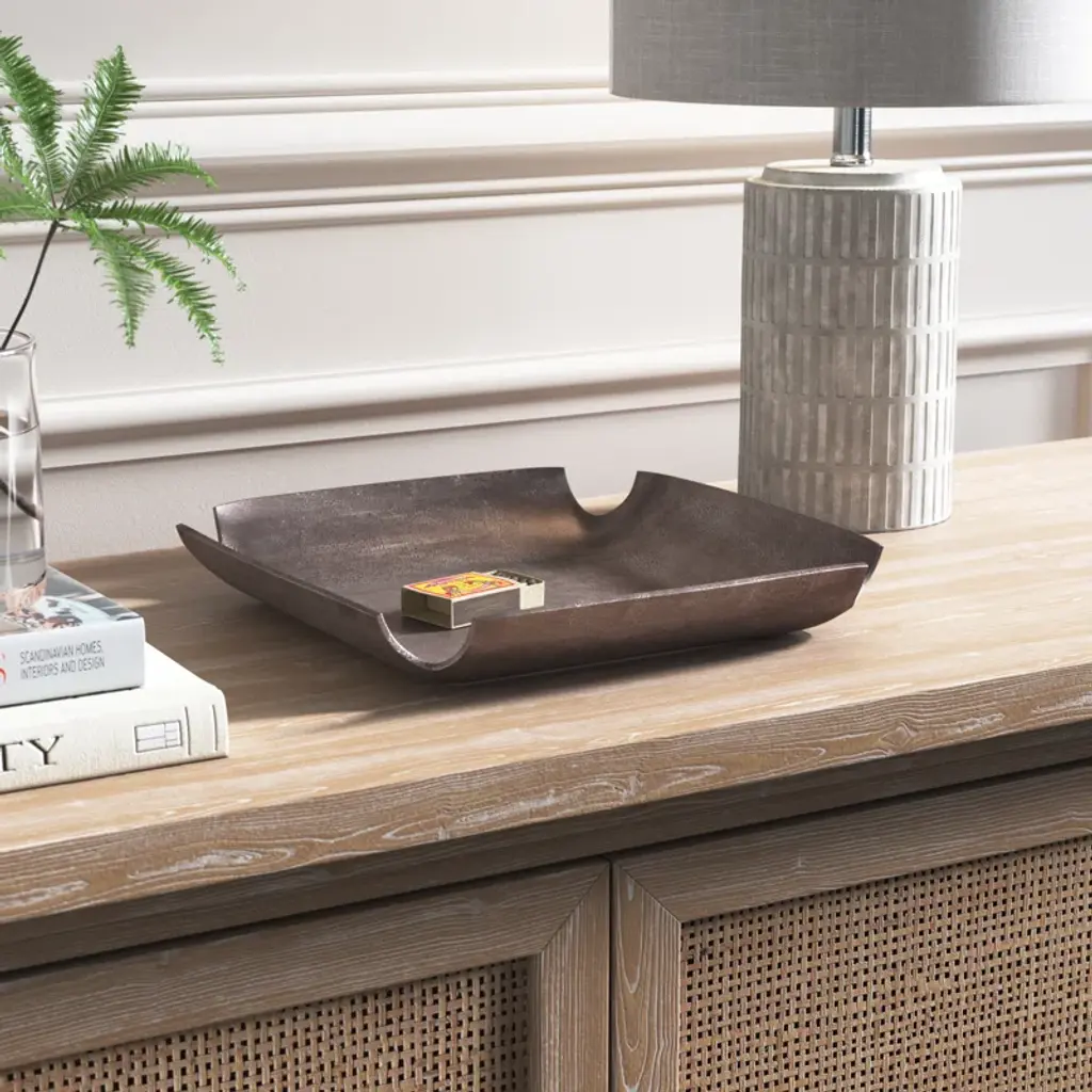 This square serving tray features notched corners for a modern update to a classic, clean-lined style. It's made in India from thick aluminum metal with edges that bend upward to create the sides of the tray. Thanks to those high edges, you never have to worry about anything rolling off the sides. This tray is ideal for serving drinks and snacks to guests, or using as a centerpiece to hold candles, potpourri, flower vases, and so much more. Plus, it also makes a thoughtful housewarming gift for that friend or family member who loves to entertain.