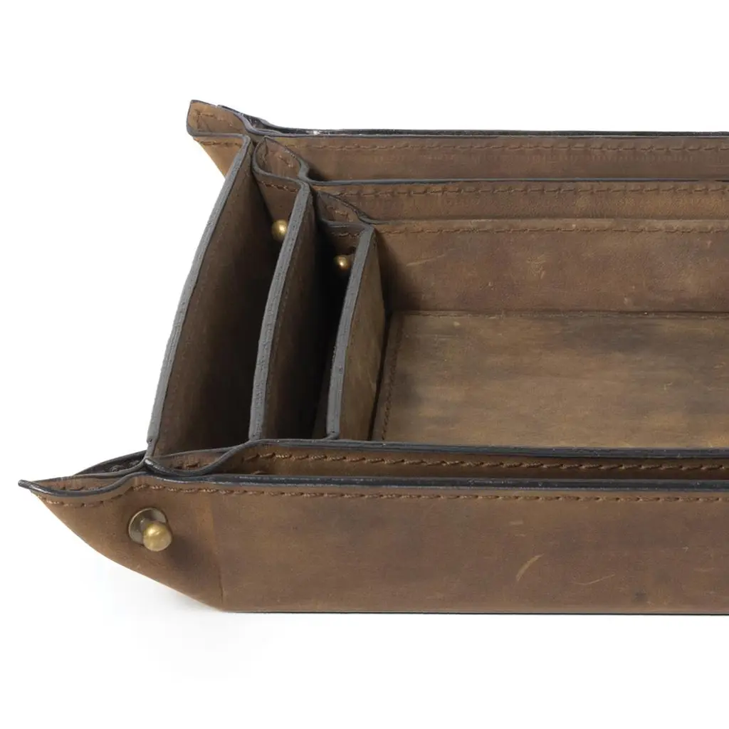Derby Industrial Brown Leather Brass Button Decorative Tray - Set Of 3