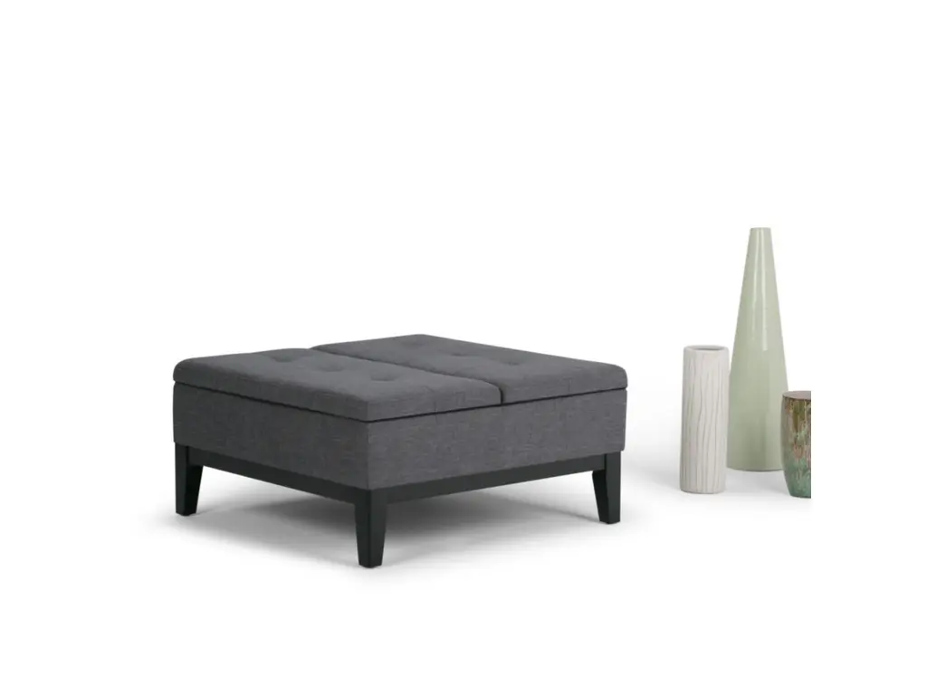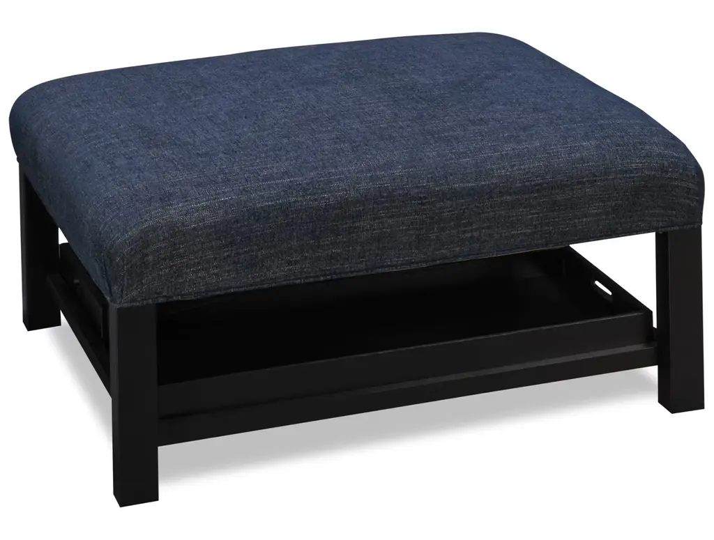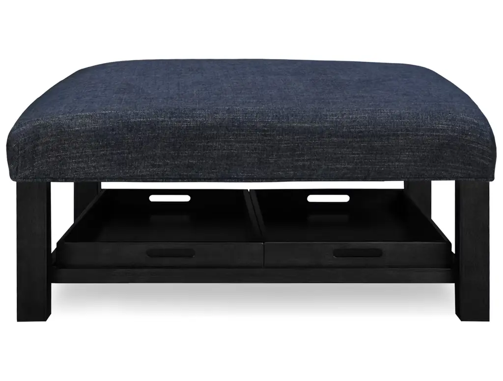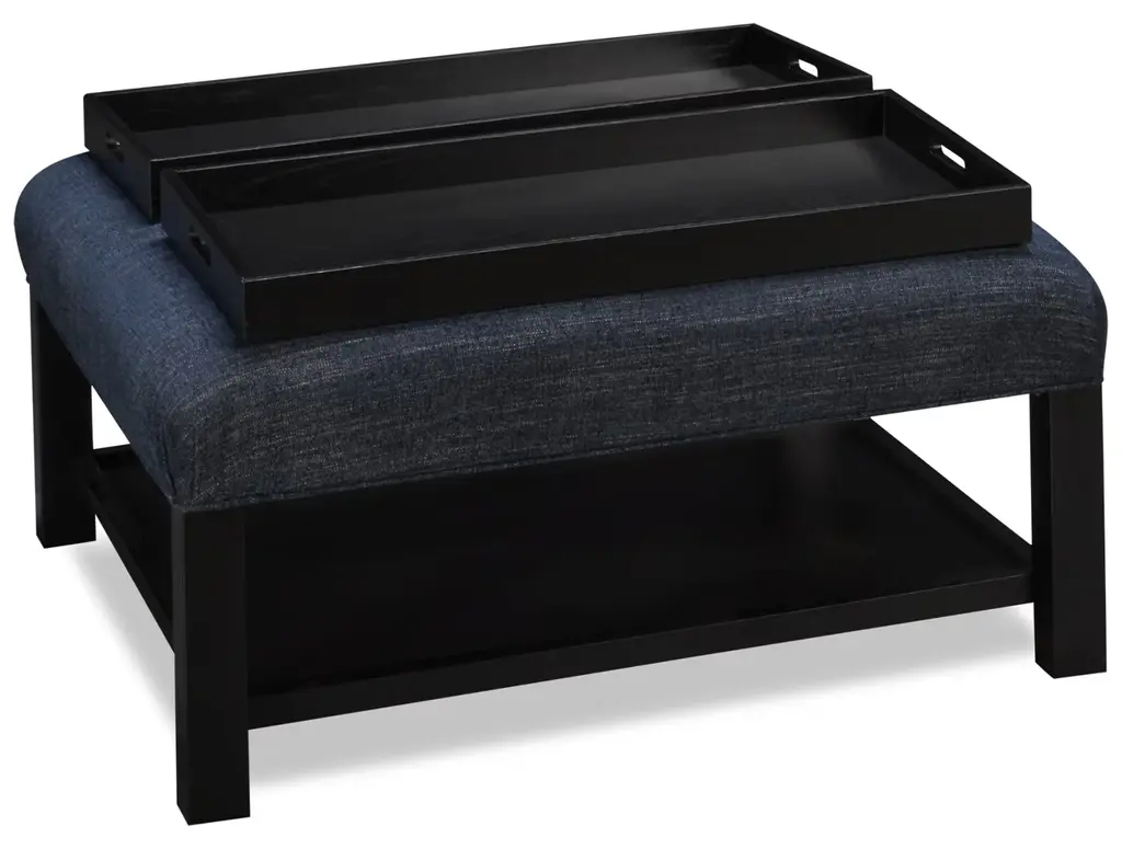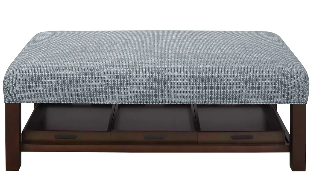 The Craftmaster Design Series Cocktail Ottoman with Trays makes entertaining a breeze. The blue upholstered top is supported by square legs, and the bottom shelf stores two rectangular black trays that will fit on the top to serve family and guests. Custom-order fabrics are available.