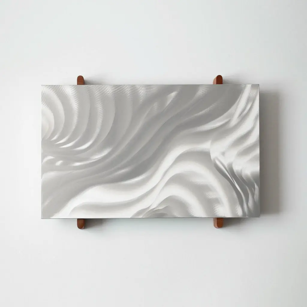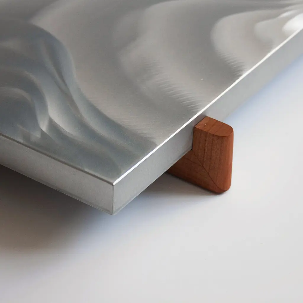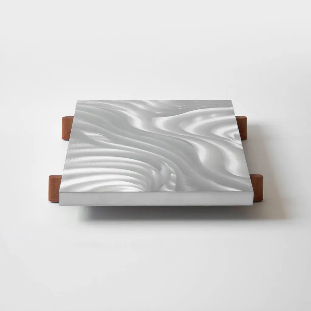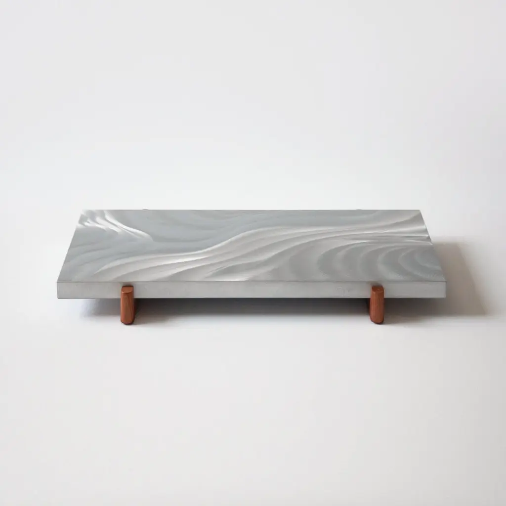 The Meltemi Tray – an offspring of the Meltemi cabinet – features the same experimental surface treatment. Like the Aegean winds, the tools and the metal surface dictate the final sculptural finish of this rectangular tray.! Please note that the aluminum pattern on each piece is unique and handmade. Therefore no one tray will be the same!