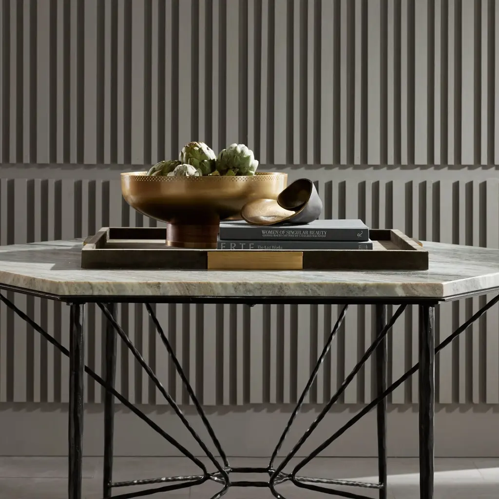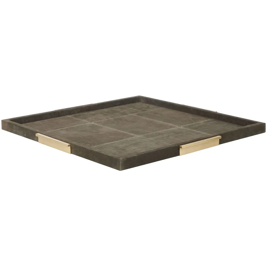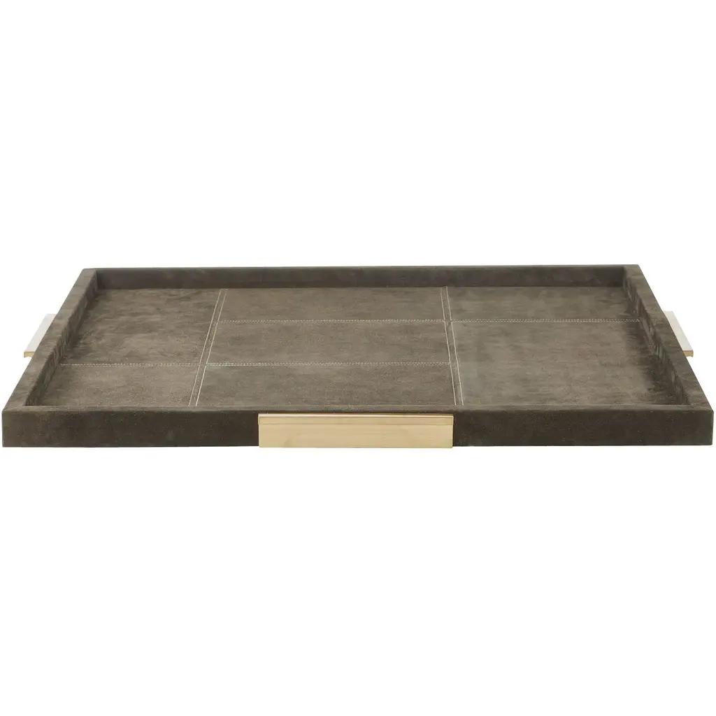 Adorned With Asymmetric Patchwork Stitching, An Oversized Tray Of Moss-gray Suede Makes An Impactful Addition To Any Surface. Finished With Four Antique Brass Steel Handles For Easy Mobility. Finish Will Vary.