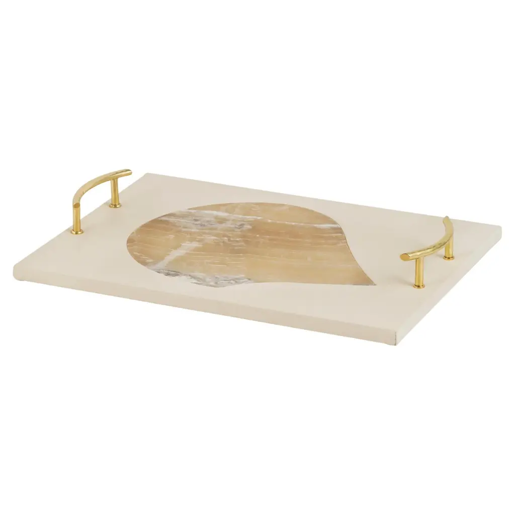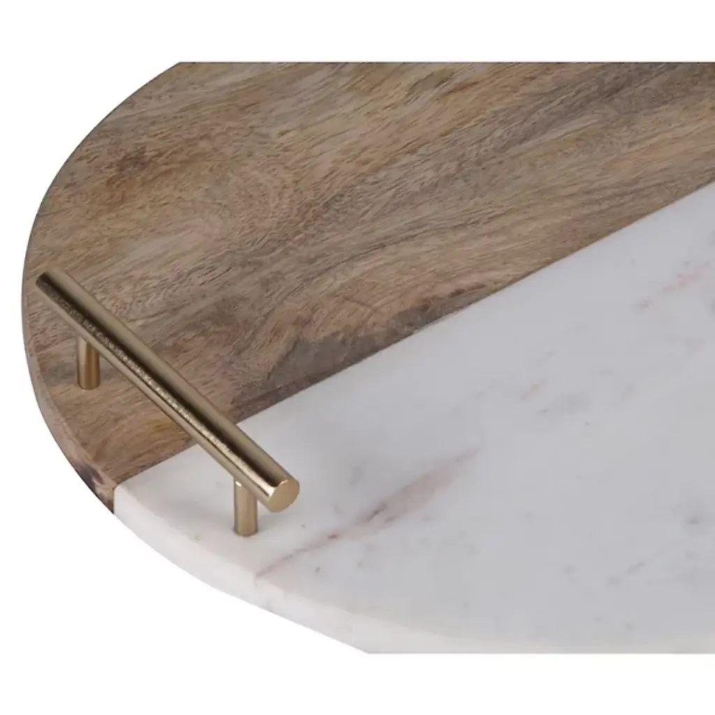 Create a memorable impression with the balanced, dramatic construction of the Dinova Tray from Renwil. A clever study in contrasts crafted in India, its disc shape fuses a semi-circle of mango wood with one of marble, creating a rustic and classical blend of textures, while two cylindrical, plated metal handles join each side, elevating the tray with a touch of robust refinement.
