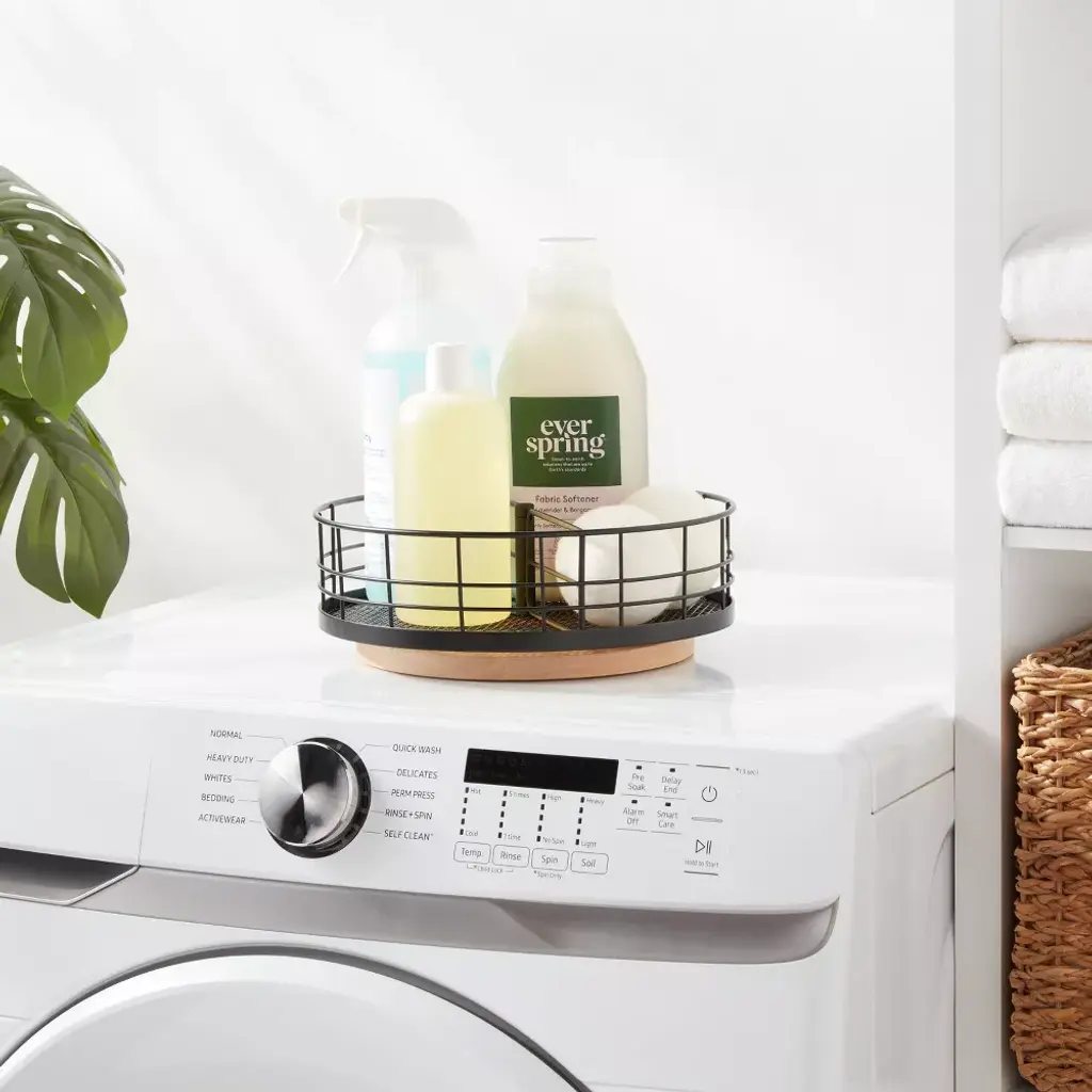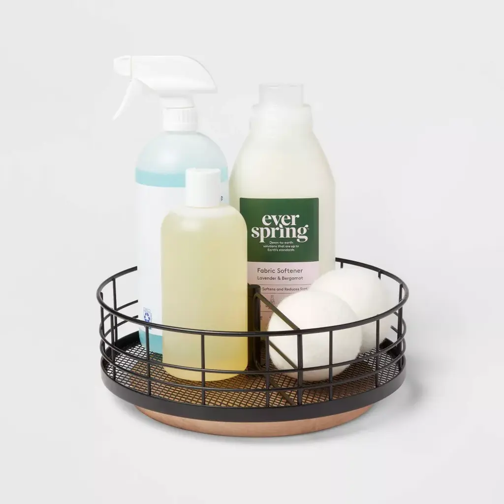 Store everyday items on a countertop while keeping them easily accessible with this Wire Divided Turntable with Natural Wood from Brightroom™. This divided turntable has a round silhouette that makes it ideal for organizing condiments in the refrigerator and household items in the bathroom cabinet. This decorative storage basket has a open black wire design with wooden base that adds a new level of stylish convenience to your home. Simply spot or wipe clean to keep it looking great.Brightroom™: See your space in a new light.Dimensions: Top and Bottom: 11-inch diameterOverall height: 3.75 inchesInterior height: 2.5 inchesInterior top and bottom: 10.5-inch diameter