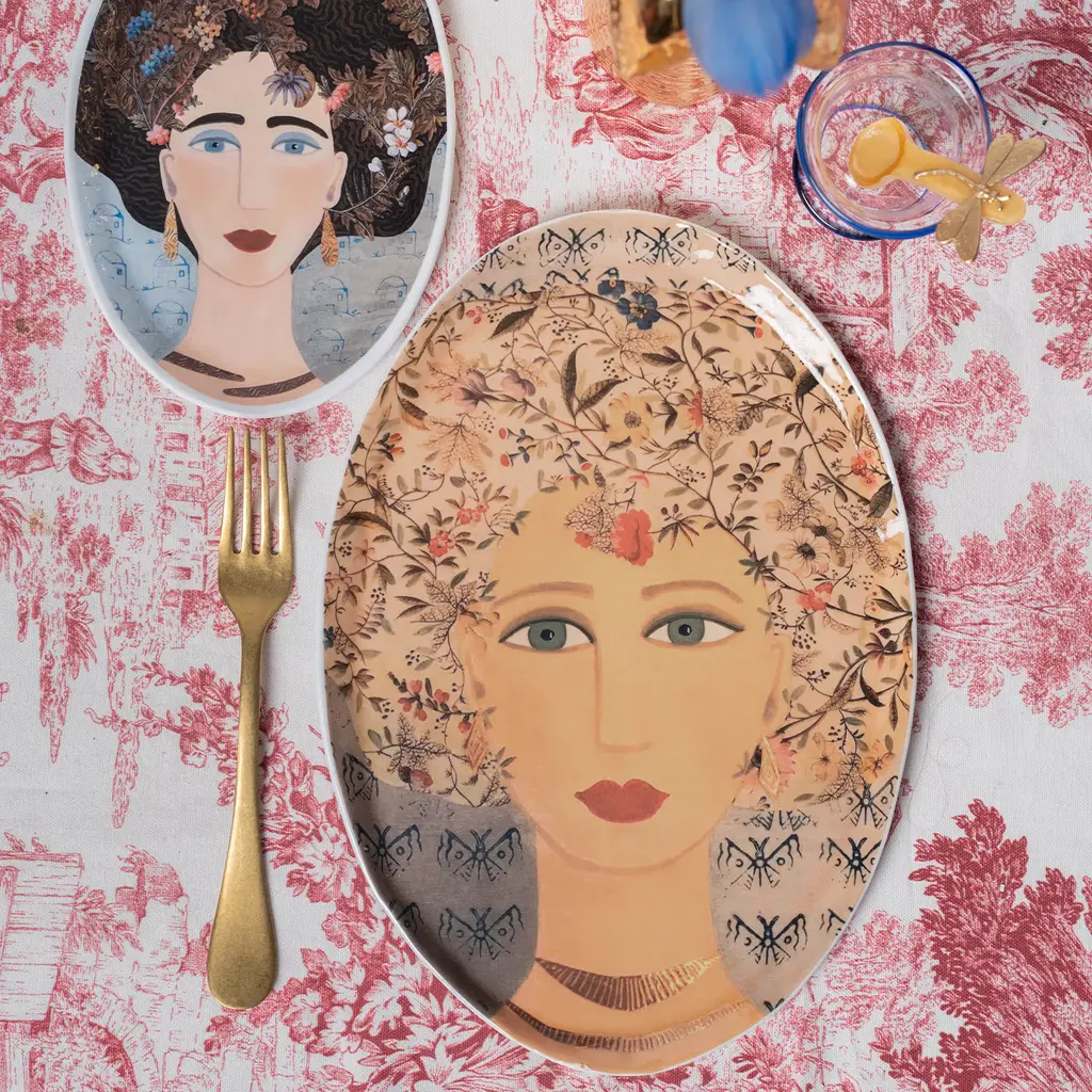 Donne Fiorite is a special collection realized in partnership with the artist AdC (Anna de Carlo), who first painted these ladies on canvas. Each with her own name and personality, their portraits are transferred on Murano Glass with a decalco technique. Available sizes: Plate Ø 14cm, Plate Ø 28cm, Oval Tray 20x14cm, Oval Tray 30x21cm, Oval Tray 40x28cm. Please ask the Concierge for details.