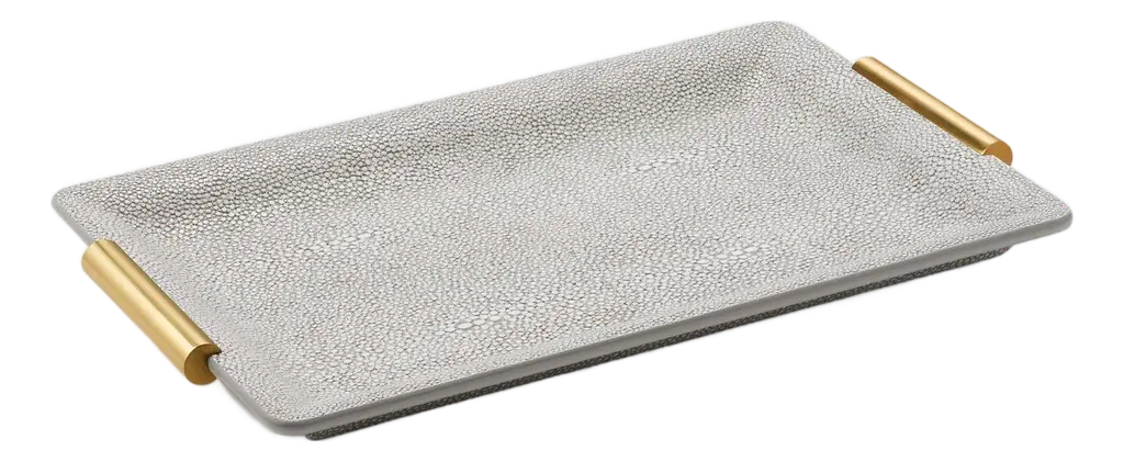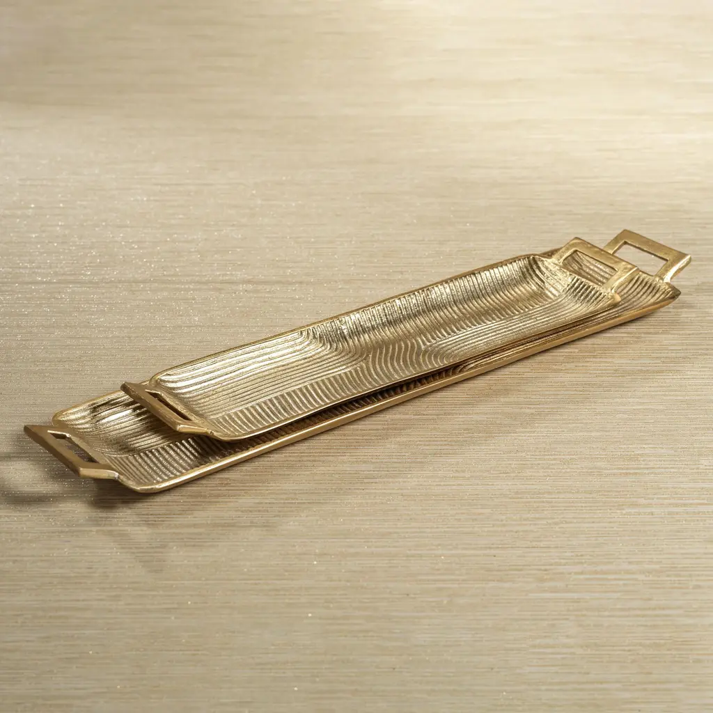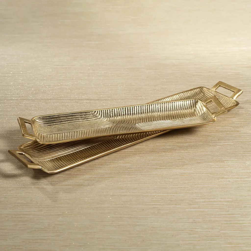Decorate a console or coffee table with this textured rectangular tray. Made from aluminum with open side handles, this long rectangular tray is simple and chic. Perfect for serving appetizers, displaying candles and other decorative items, or organizing essentials, the Donte tray is a versatile and stylish addition to any home. Textured finish with its subtle horizontal and vertical grooves. Long rectangular tray. Made of aluminum. Slightly raised sides With side handles. Dry cloth to clean.