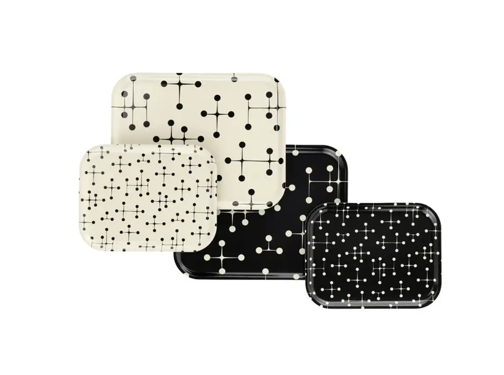 Dot Pattern Reverse Dark is a rectangular laminate tray, part of the Classic Trays collection.The designers Alexander Girard and Charles and Ray Eames were leading figures in American design during the post-war era. While textile design was the primary focus of Girard's oeuvre, he was also admired for his work in the graphic arts as well as furniture, exhibition and interior design.The expansive oeuvre of Charles and Ray Eames not only encompasses product design, architecture, exhibition design and cinematography, but also includes a large number of graphic designs, most of which were created by Ray Eames.The Classic Trays, which are made of laminated plywood, come in assorted motifs created by Alexander Girard for various purposes and selected by Vitra in cooperation with the Girard family. The Dot Pattern was designed by Charles and Ray Eames in 1947 and later used on pillows, cushions, blankets and other objects. Temporarily available is the Sea Things pattern designed by Ray Eames in 1945.Material: laminated plywood (oak, Romania), food-safe, not dishwasher-safe.