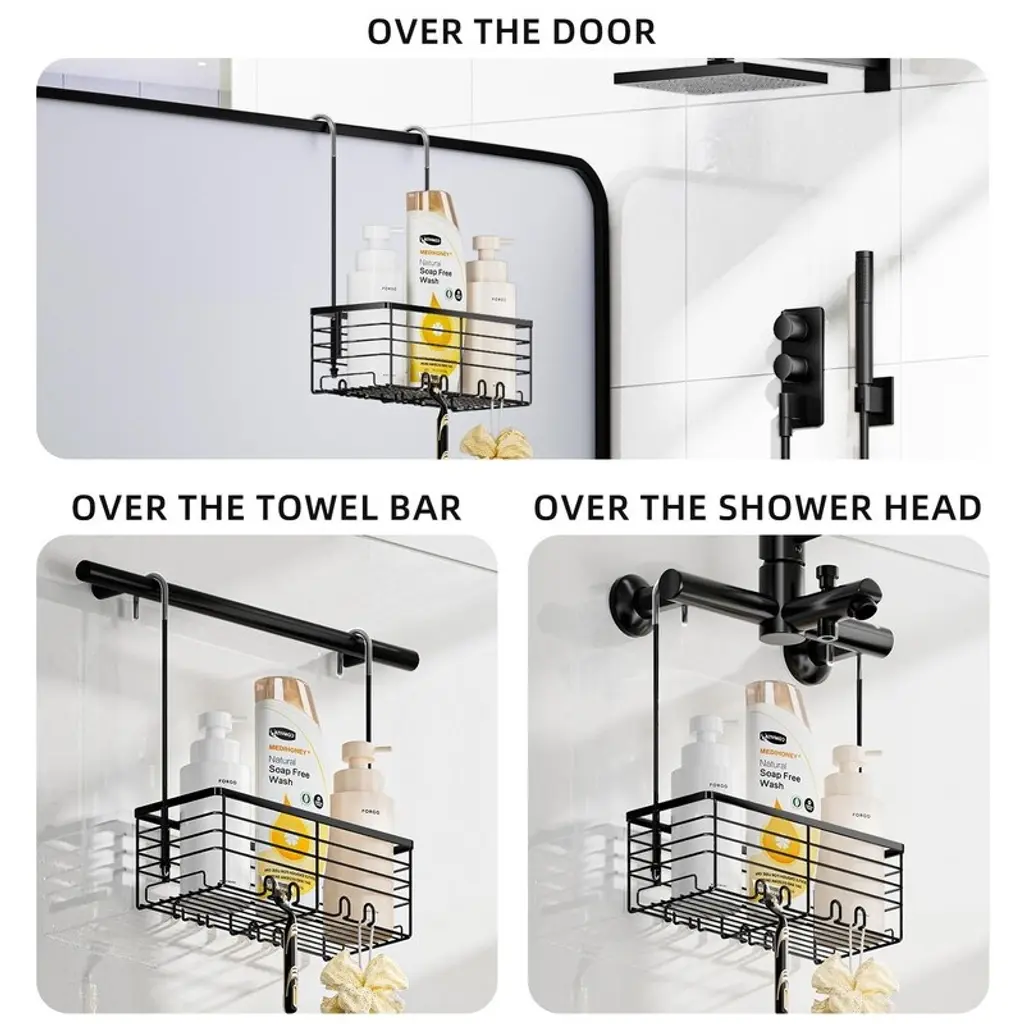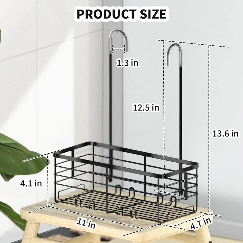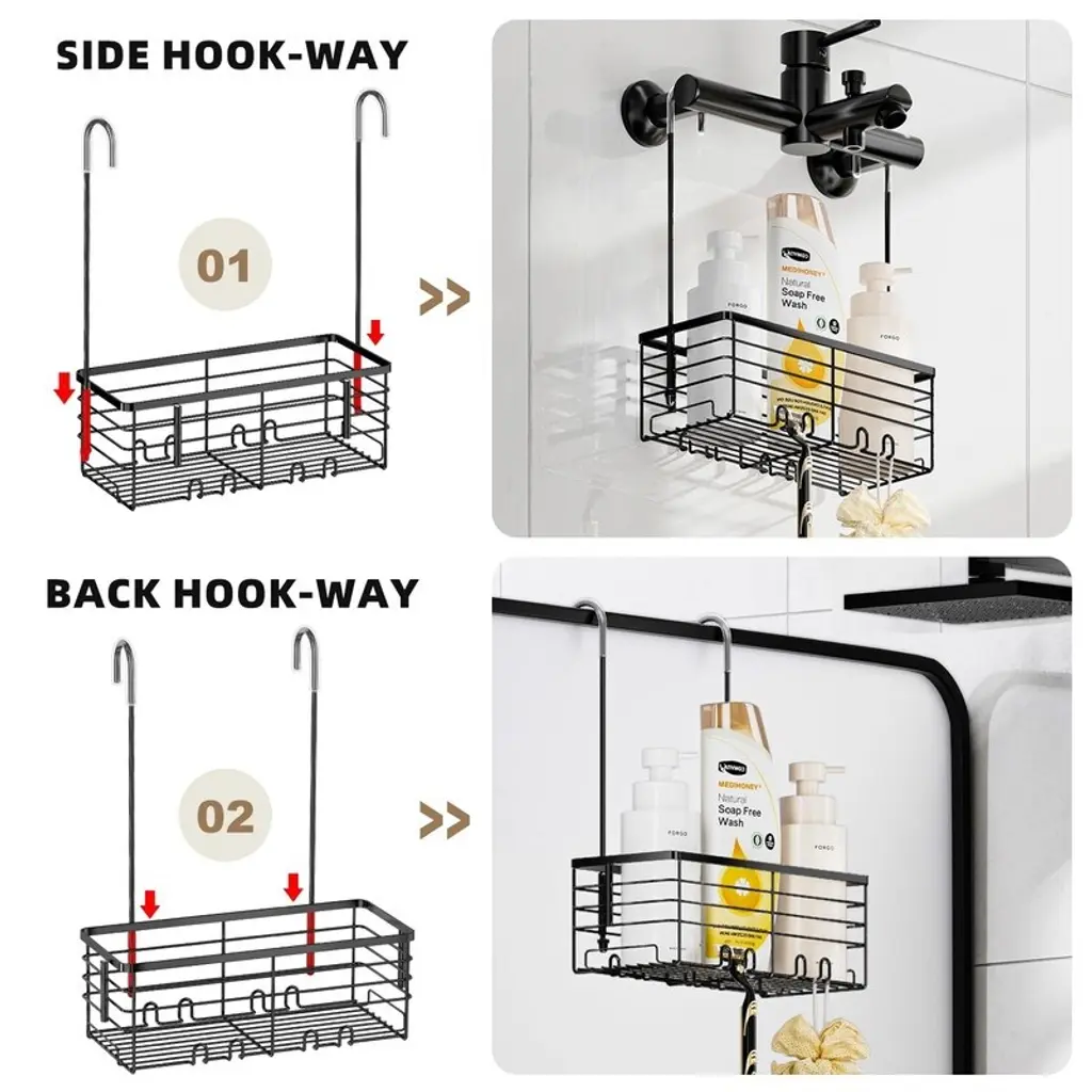Double Bathroom Shower Storage Basket, Shampoo Tray, Over The Door Shower Rack With Hooks, 304 Stainless Steel Rust Resistant - 11.1"d X 4.7"w X 13.6"h - Black
