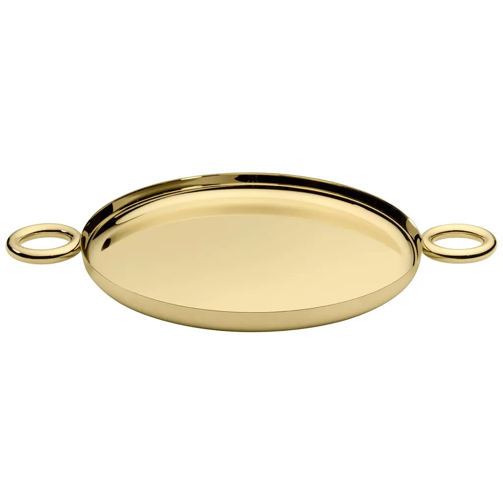As an extension of the Double-O collection of the famous champagne cooler, Richard Hutten designs the Double-O tray. A fun and essential object that brings surprise and panache to the table. The essential lines, the elegantly curved edge inwards and the large round handles, all characteristic elements of the whole Double-O family. Hutten goes beyond the established modernist "form and function", proposing a contemporary game and function.Double O Tray in 24k gold plated stainless steel.