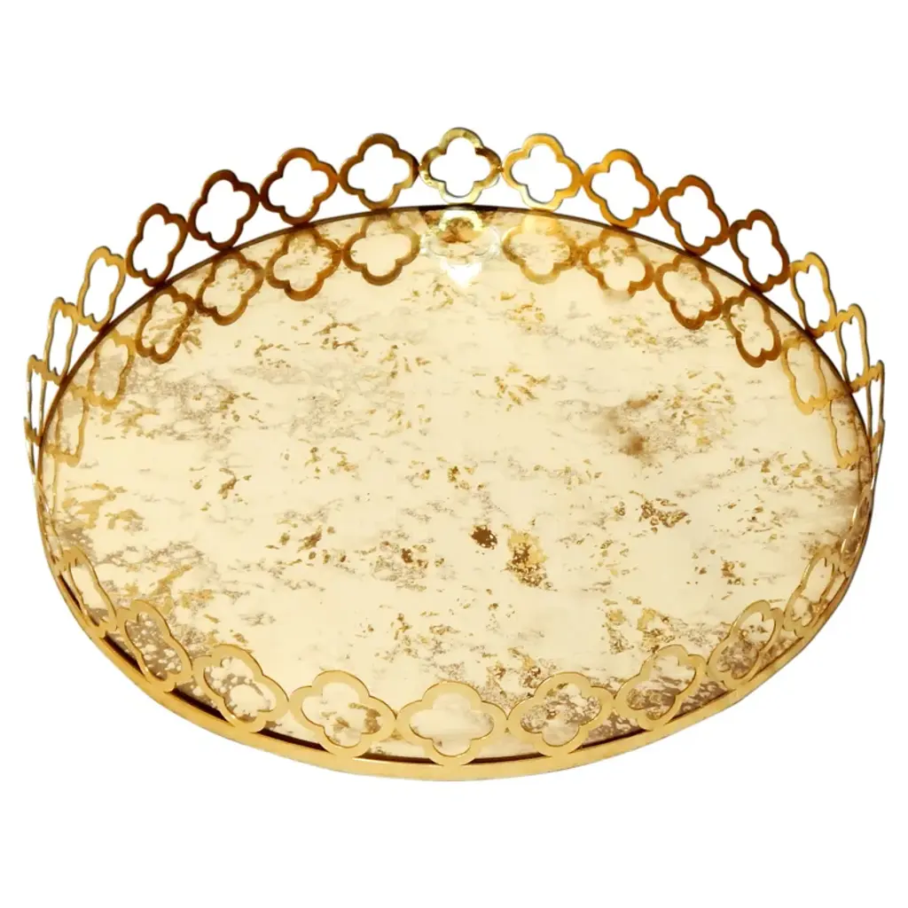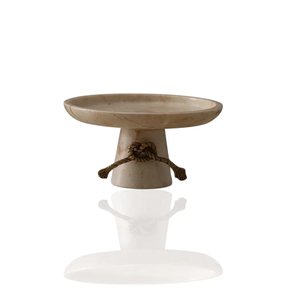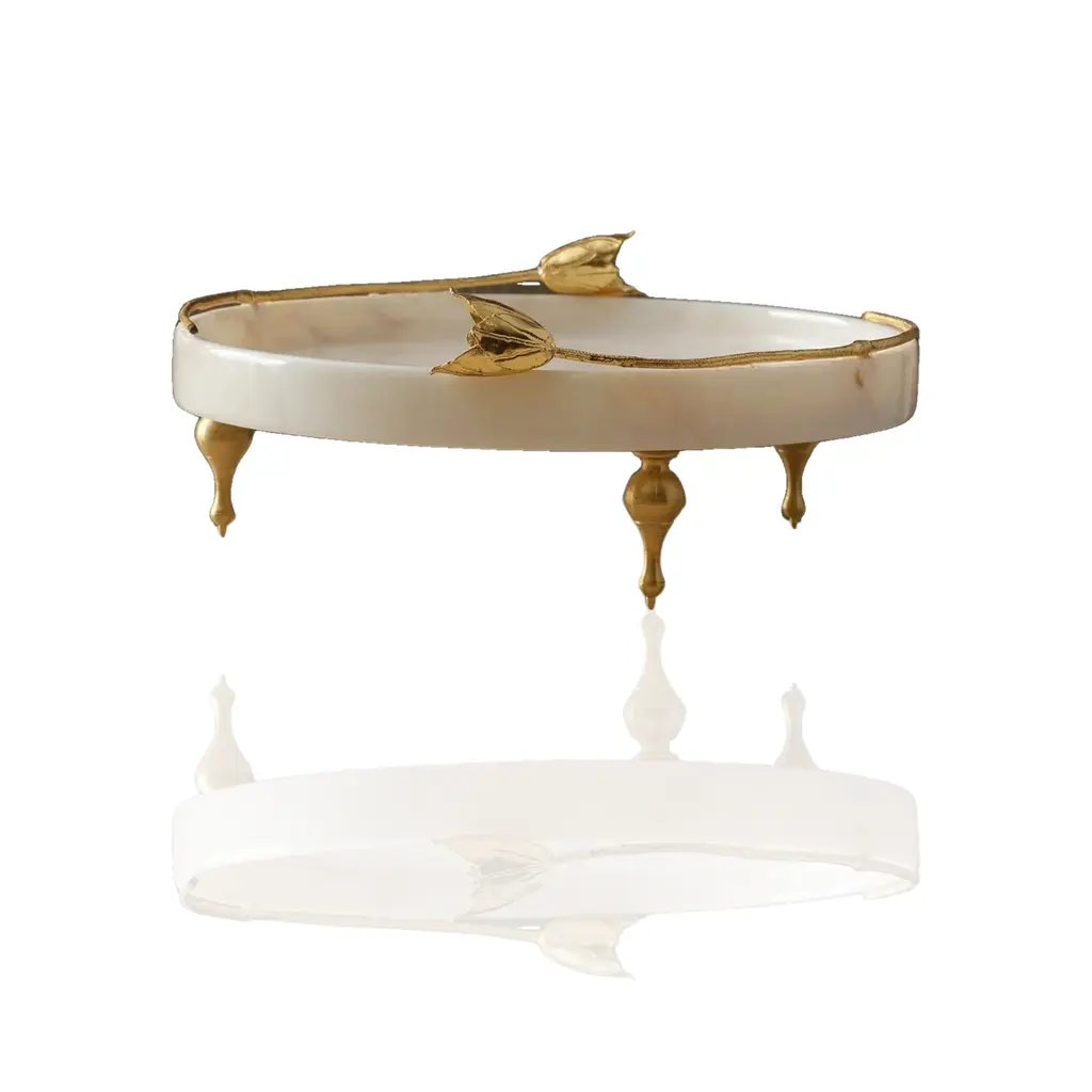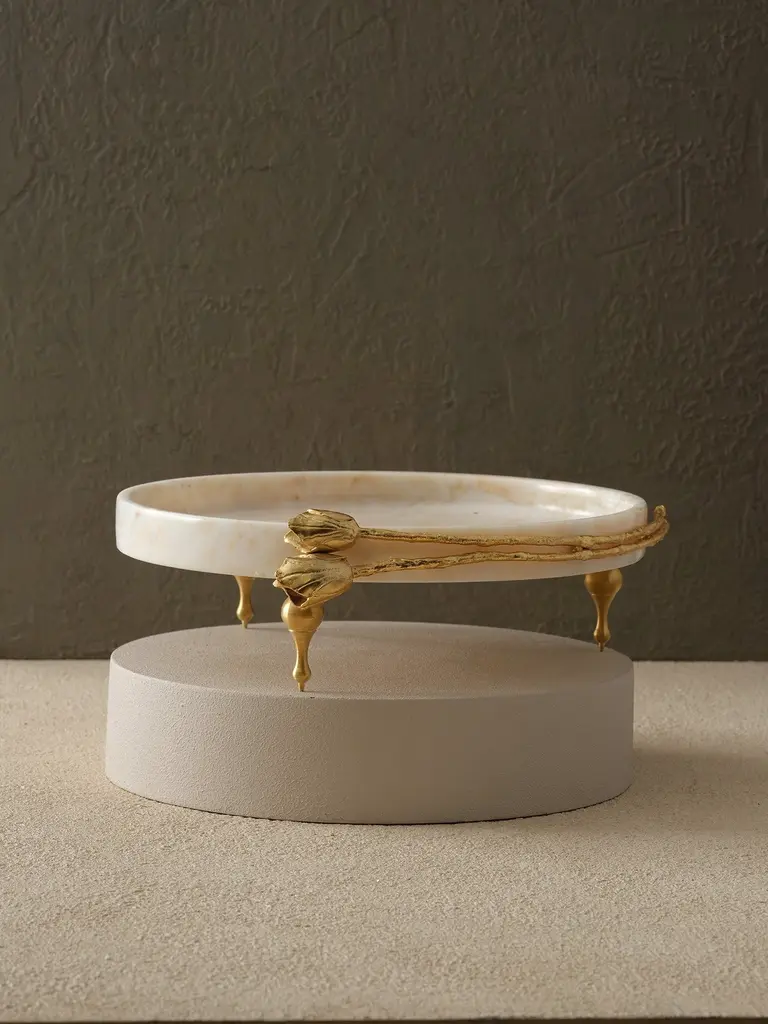 A graceful fusion of craftsmanship and nature-inspired design, the White Marble Footed Serving Tray With Double Tulip Accent brings timeless elegance to your tabletop. Handcrafted from polished white marble with subtle natural veining, this round tray is elevated on gold-toned feet and adorned with a sculptural double tulip detail that gently curves along its rim. The floral embellishment adds a romantic and artistic flair, making it perfect for both serving and display.Whether used for presenting desserts, hors d’oeuvres, or as a decorative centerpiece, this tray enhances any occasion with poise and charm.